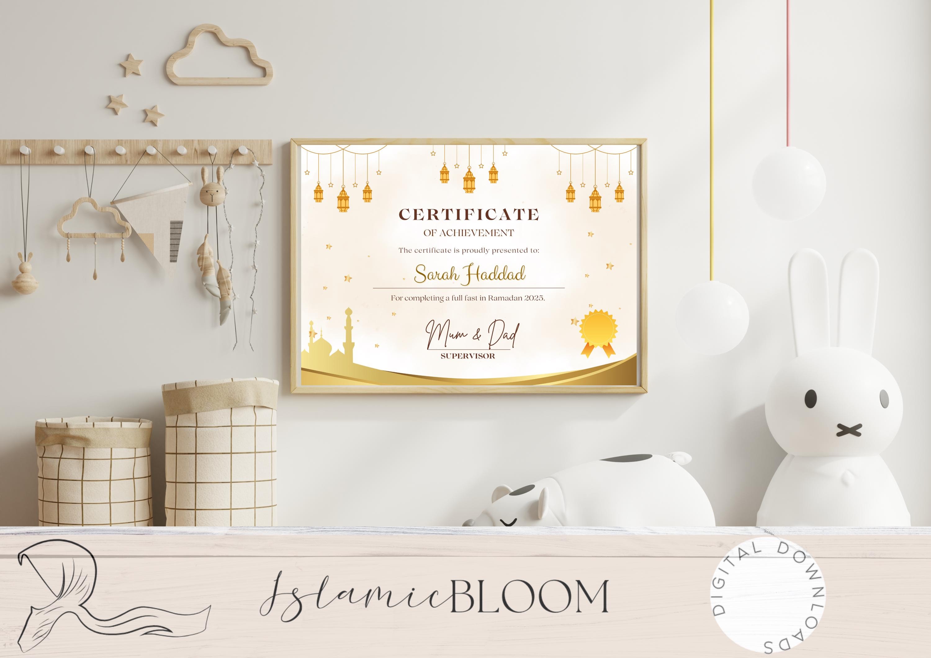 Celebrate yours or your child’s special milestone—whether it’s their first fast during Ramadan, completing the Quran, or any Islamic achievement—with this beautifully designed, fully personalised certificate! This digital download is a meaningful keepsake and can be customised with your child’s name, achievement, and supervisor details.