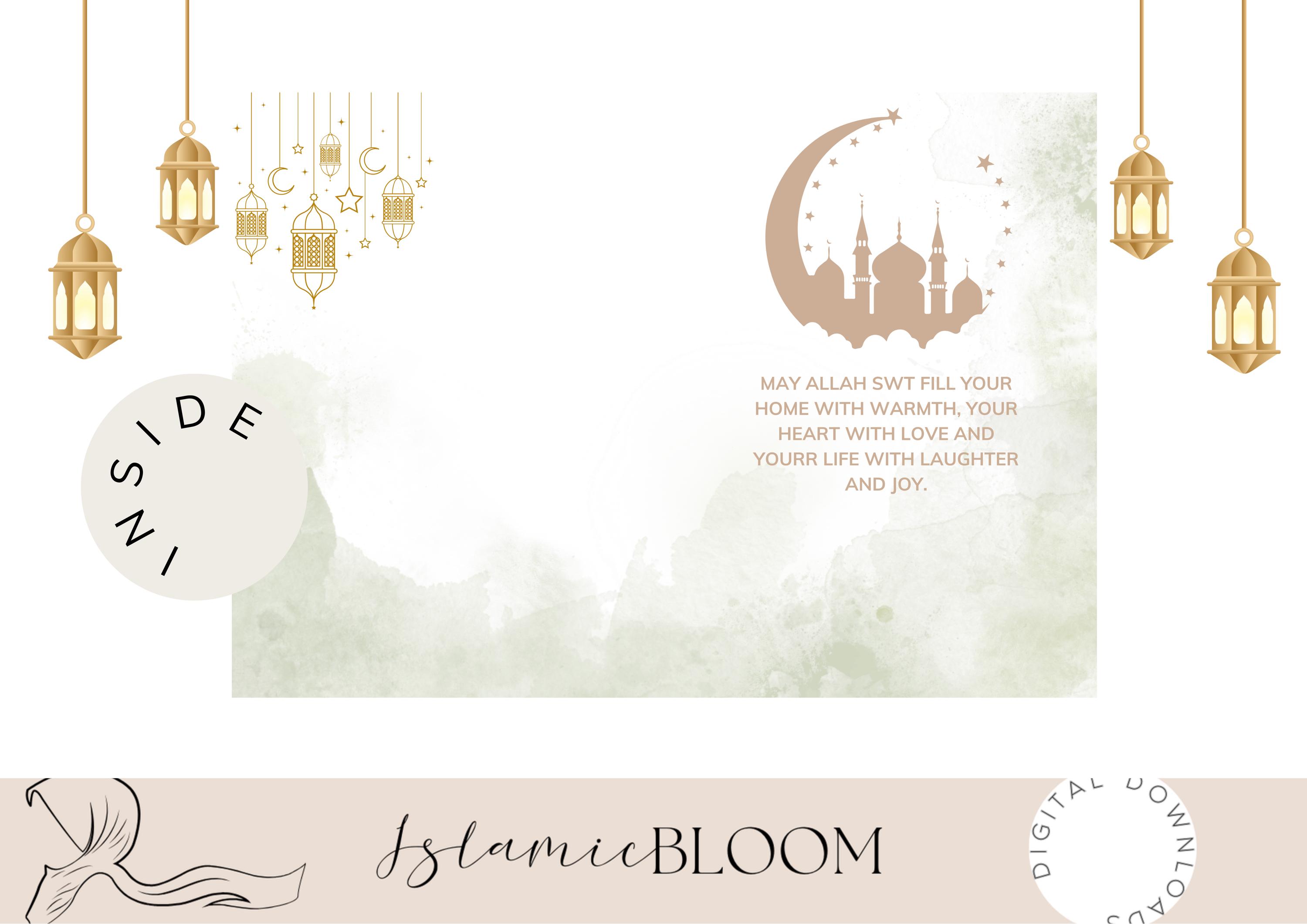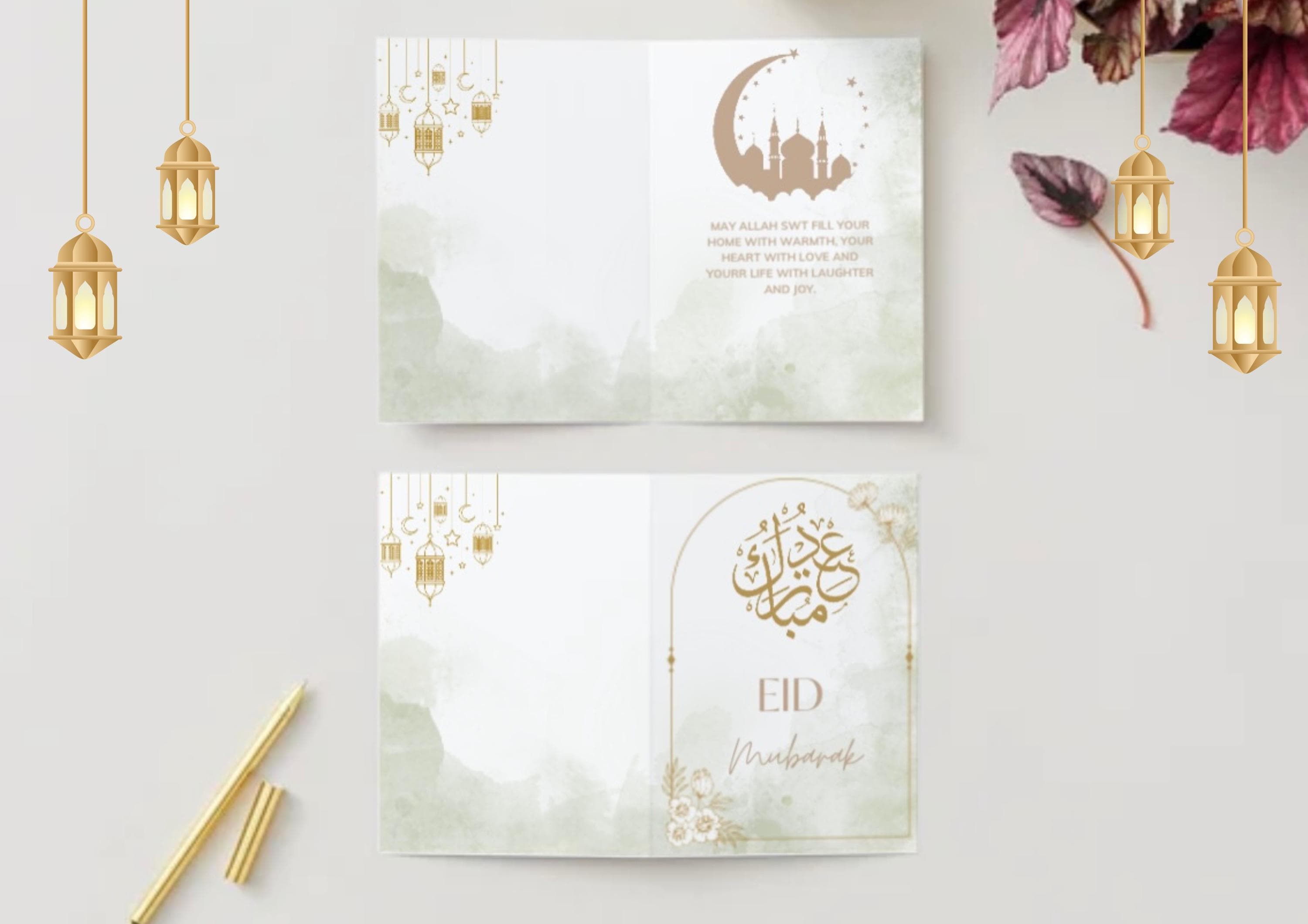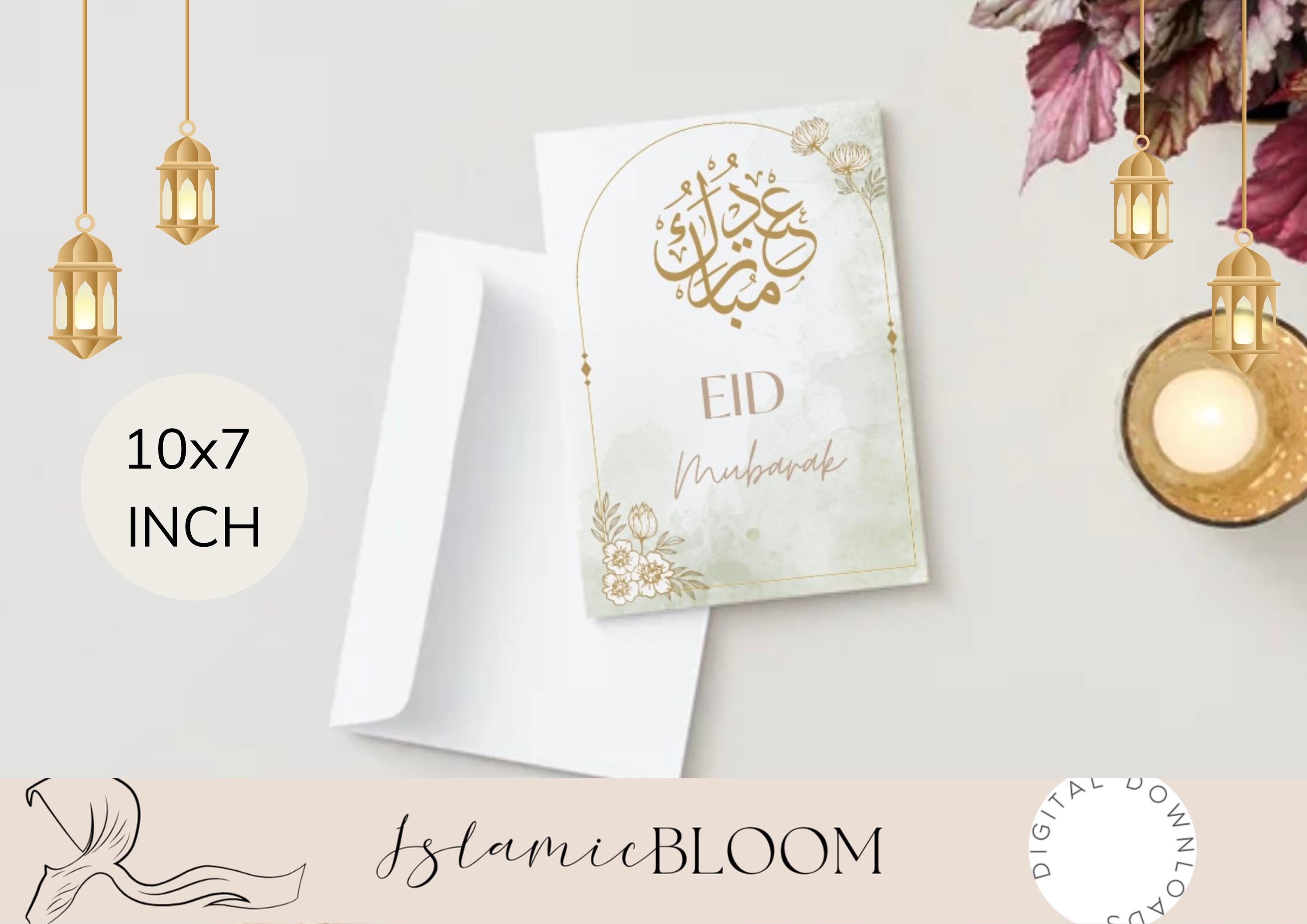 Celebrate Eid in style with this beautifully designed folded greeting card! Perfect for sending warm wishes to family, friends, and loved ones. This instant digital download allows you to print your own 10x7 inch card at home or with a professional printer.