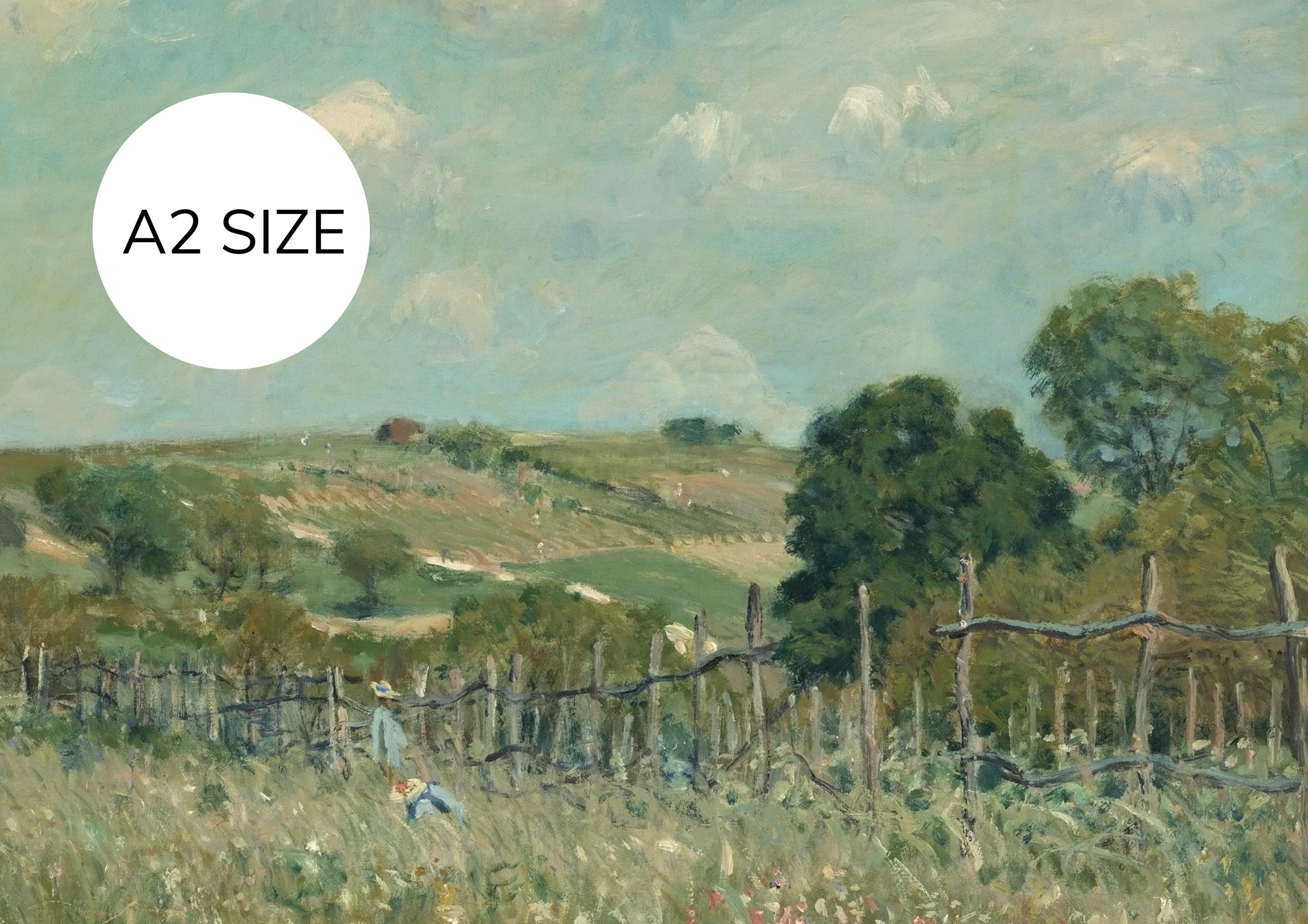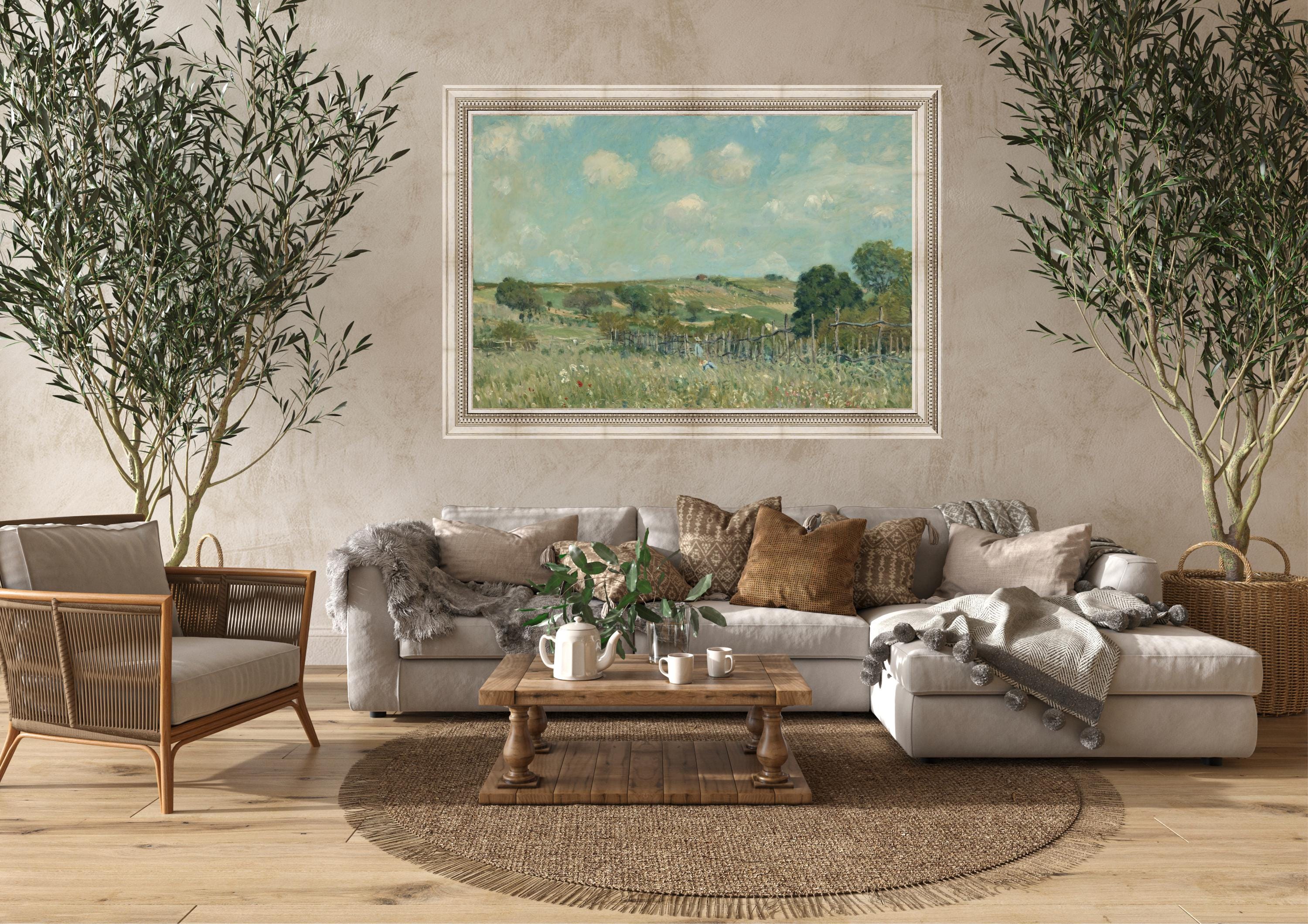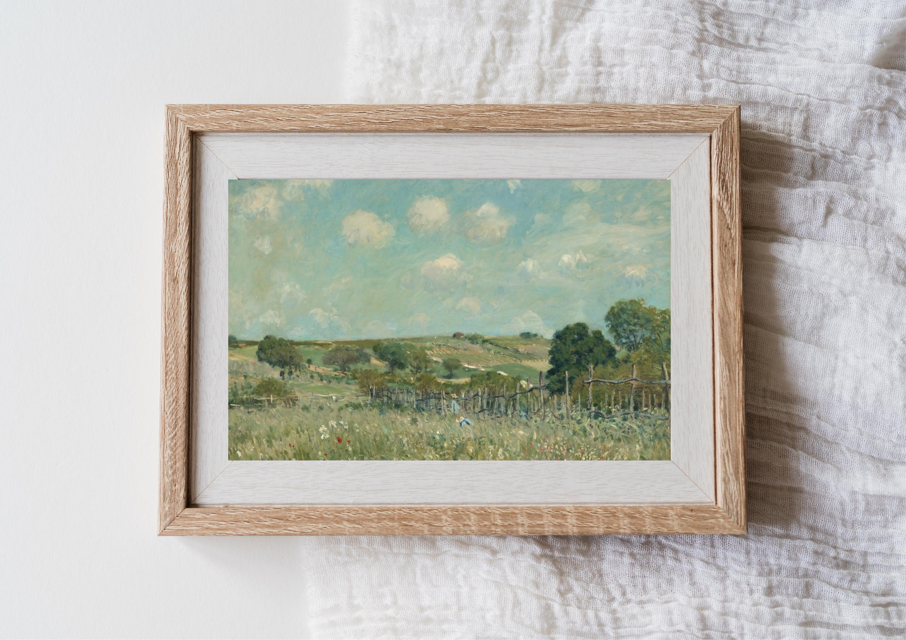 Transform your space with this beautiful rustic landscape digital print. Featuring a serene countryside scene with lush greenery, a wooden fence, and a soft blue sky, this artwork adds a calming, vintage aesthetic to any home. Perfect for farmhouse decor, cottagecore lovers, and nature-inspired interiors.
