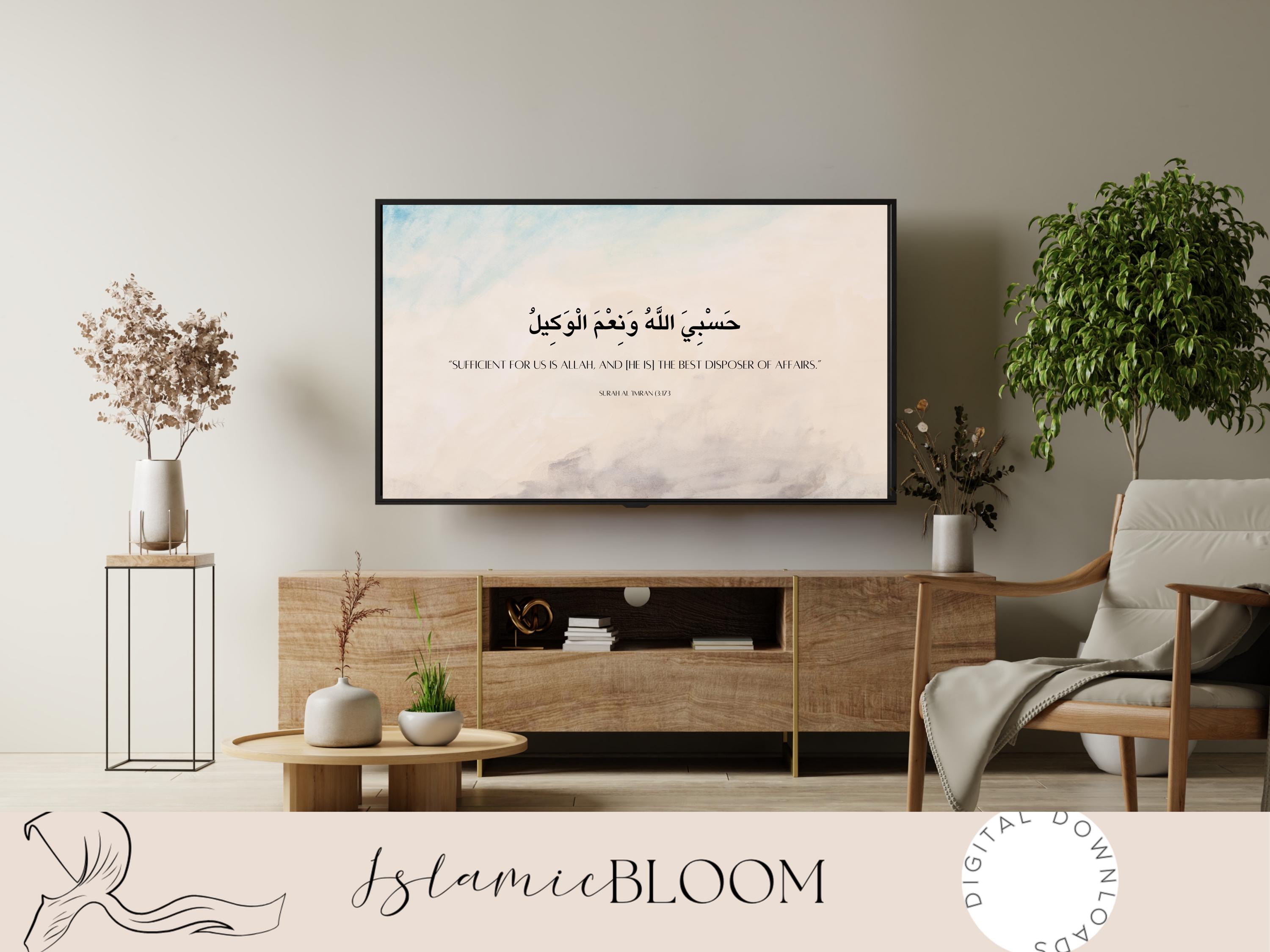 Enhance your home with this elegant Islamic TV frame art, designed for Samsung Frame TVs. Featuring a timeless Quranic verse, this digital artwork blends spirituality with modern aesthetics, creating a serene and uplifting atmosphere in your living space.
