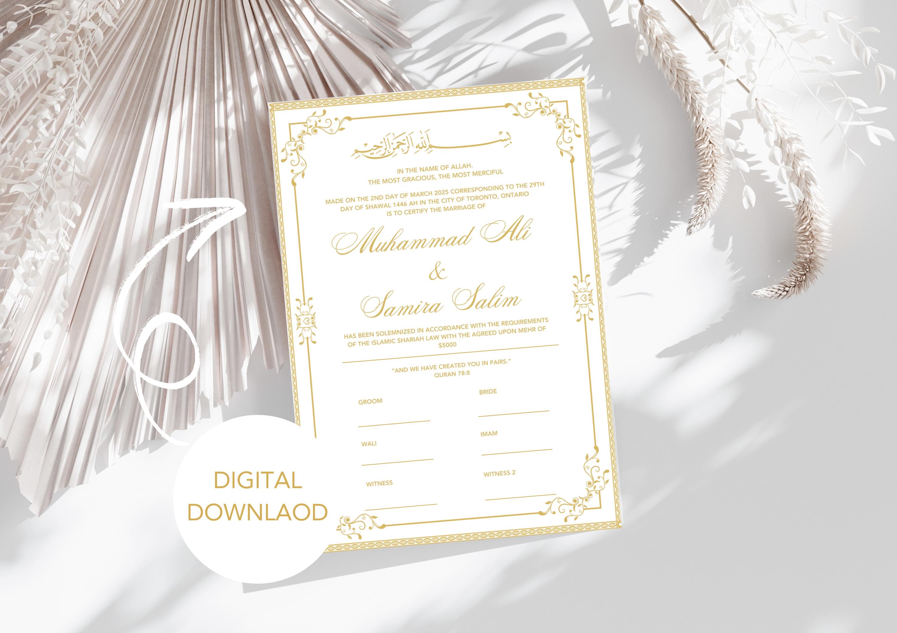 Perfect for Islamic weddings, Nikah ceremonies, Muslim couples, and Halal marriages. Download, print, and cherish this meaningful document forever!