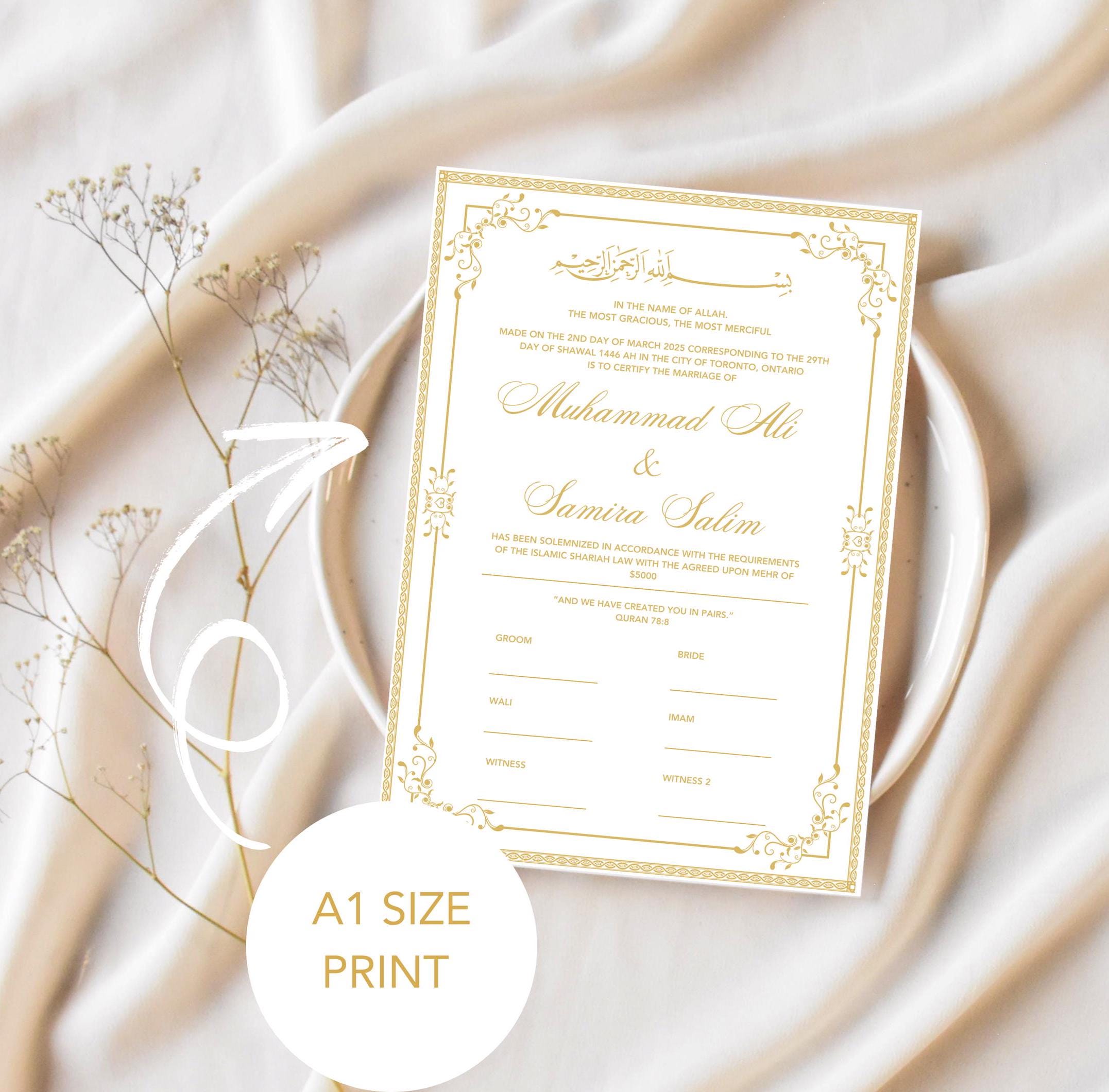Celebrate your sacred union with this beautifully designed Islamic Marriage Certificate (Nikah )– a perfect keepsake for Muslim weddings. This digital download features an elegant, modern design with Quranic verses, customizable with your names and wedding details. Ideal as a Nikah certificate, a thoughtful Islamic wedding gift, or a stunning keepsake for newlyweds.