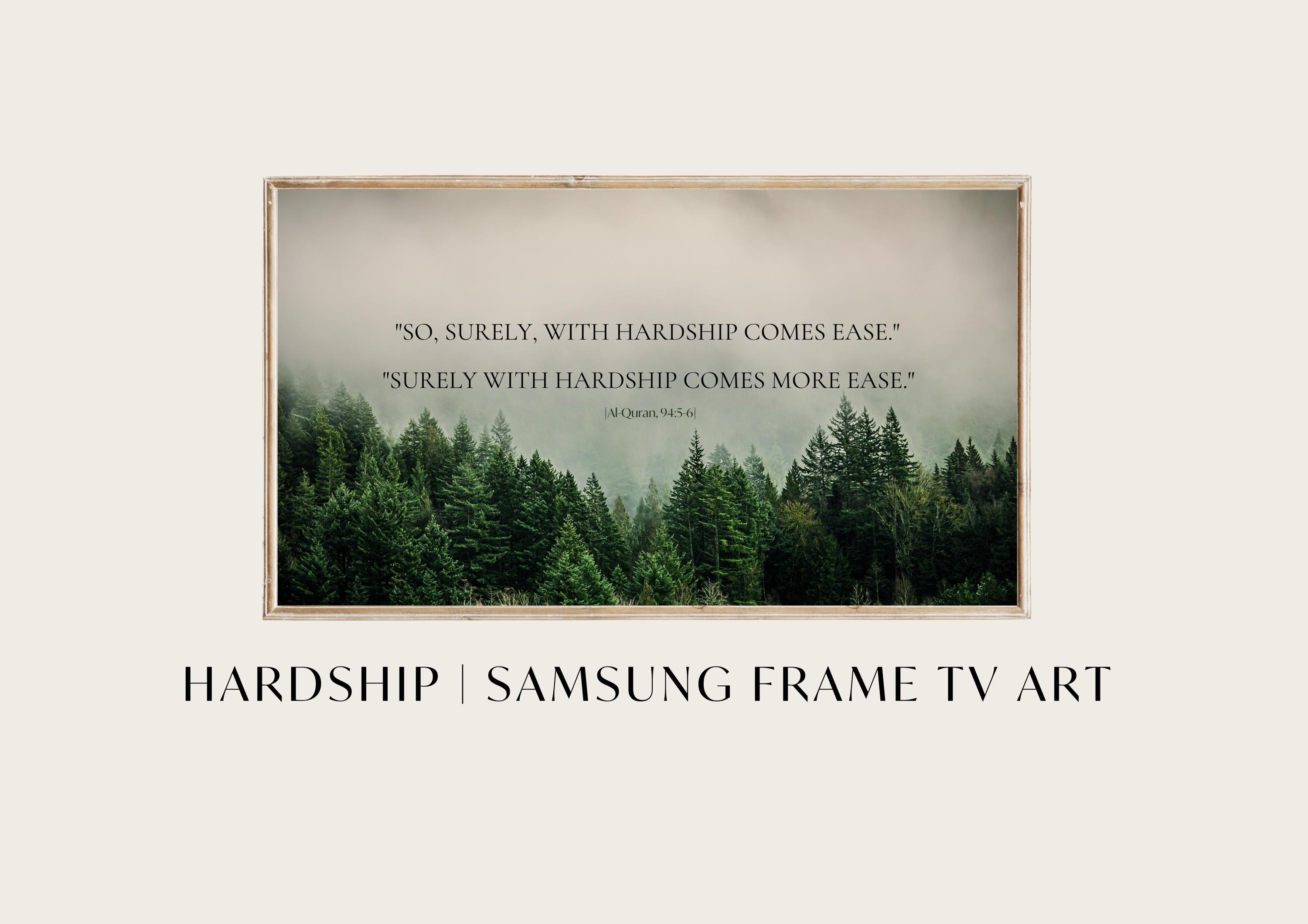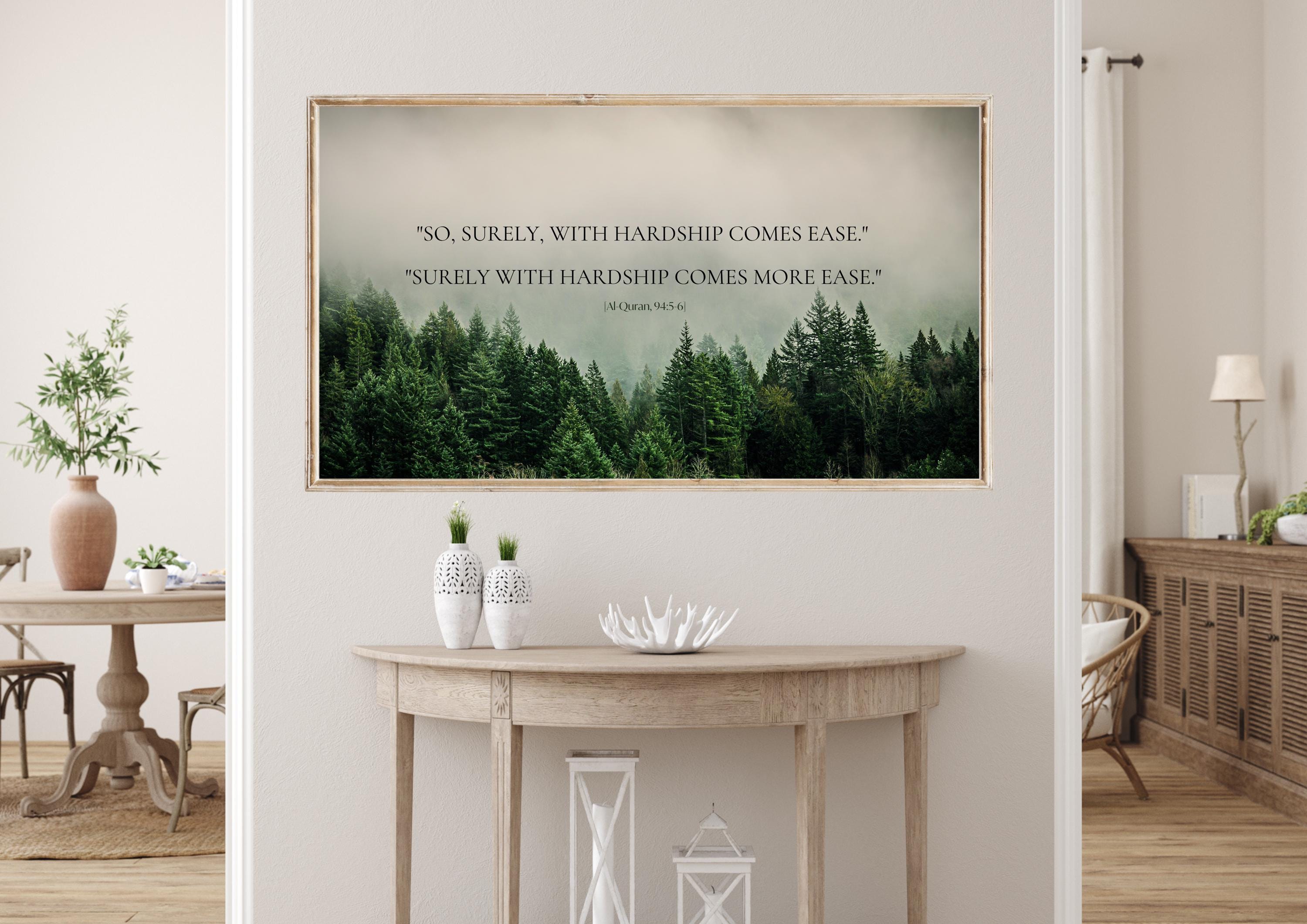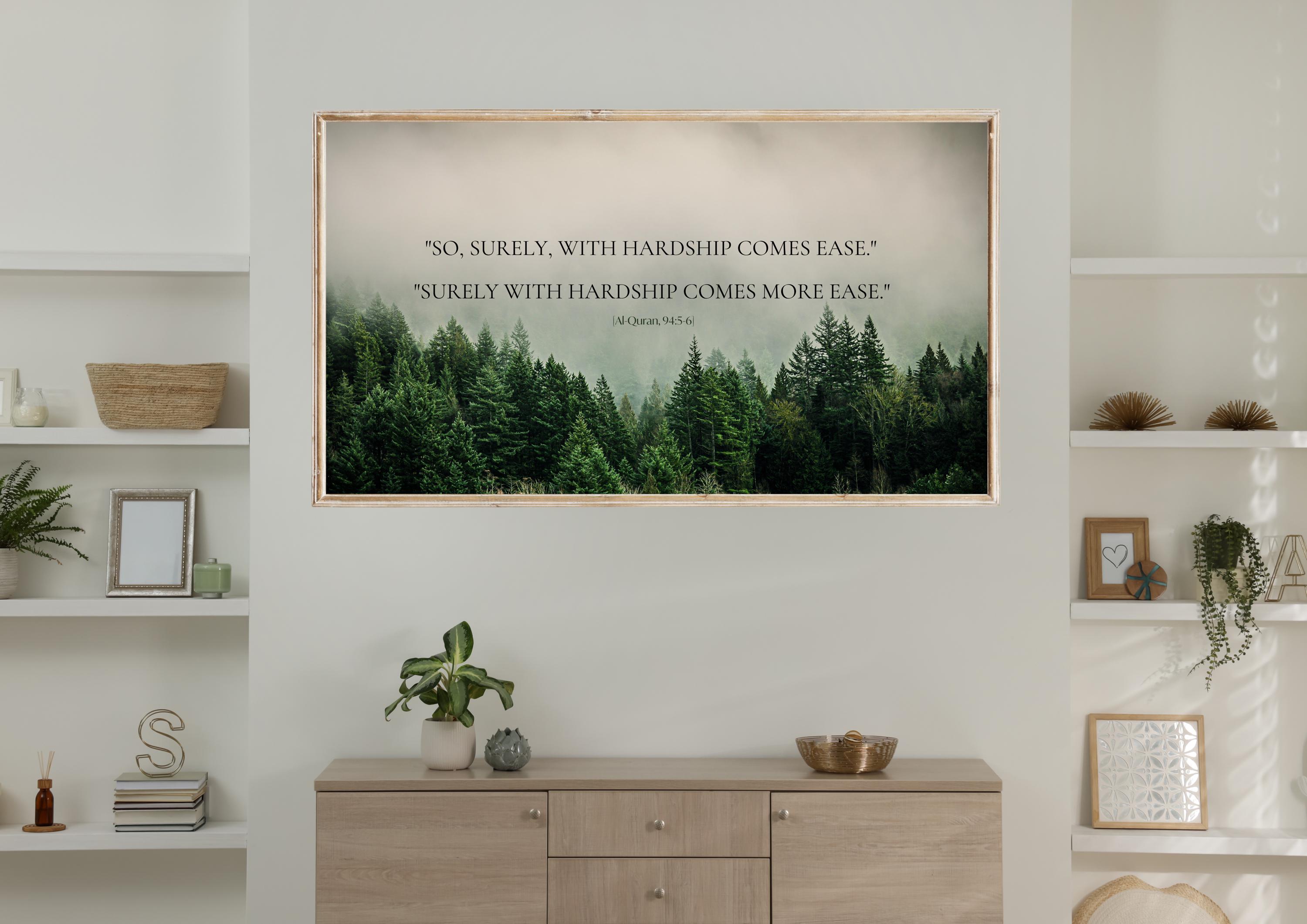 Enhance your living space with this beautifully designed Samsung Frame TV Art featuring the inspiring Quranic verse: “So Surely With Hardship Comes Ease.” This high-resolution digital download is perfect for creating a serene and elegant ambiance in your home.