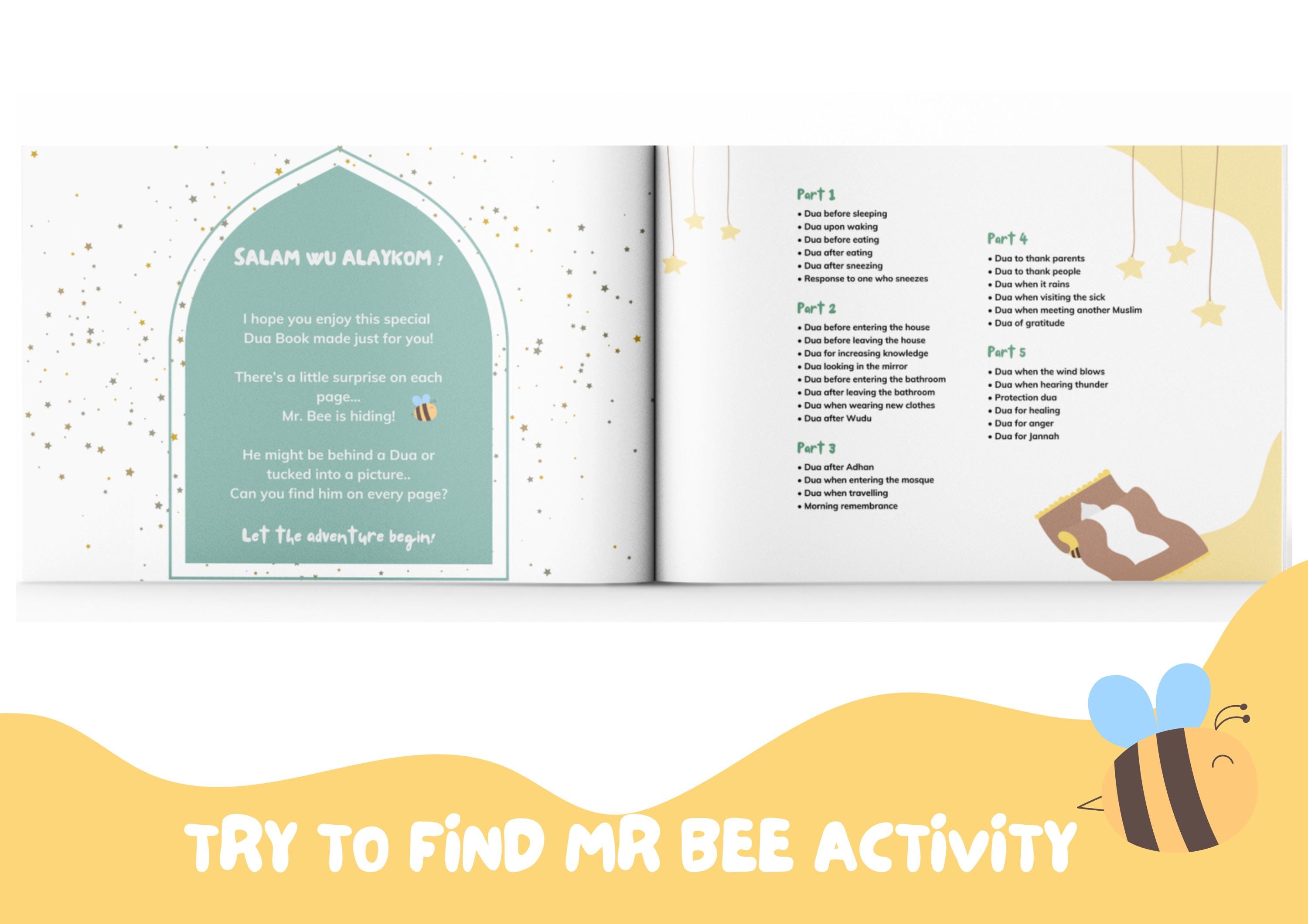 Looking for a fun, educational, and faith-filled activity for your little ones? My Dua Book is a beautiful printable A4 landscape booklet filled with essential daily duas, cute illustrations, and a fun twist – Mr. Bee is hiding on every page! Can your child find him all?