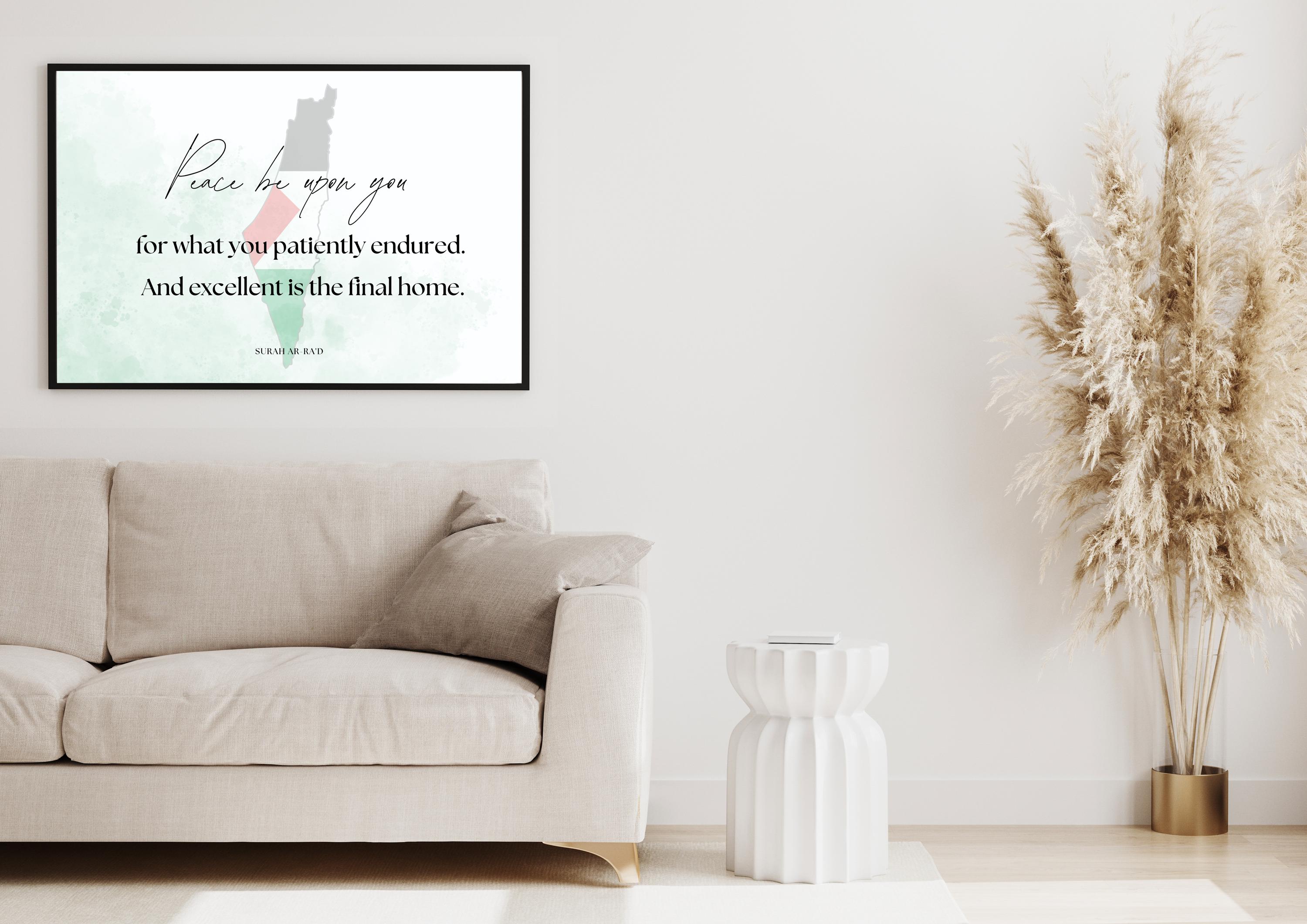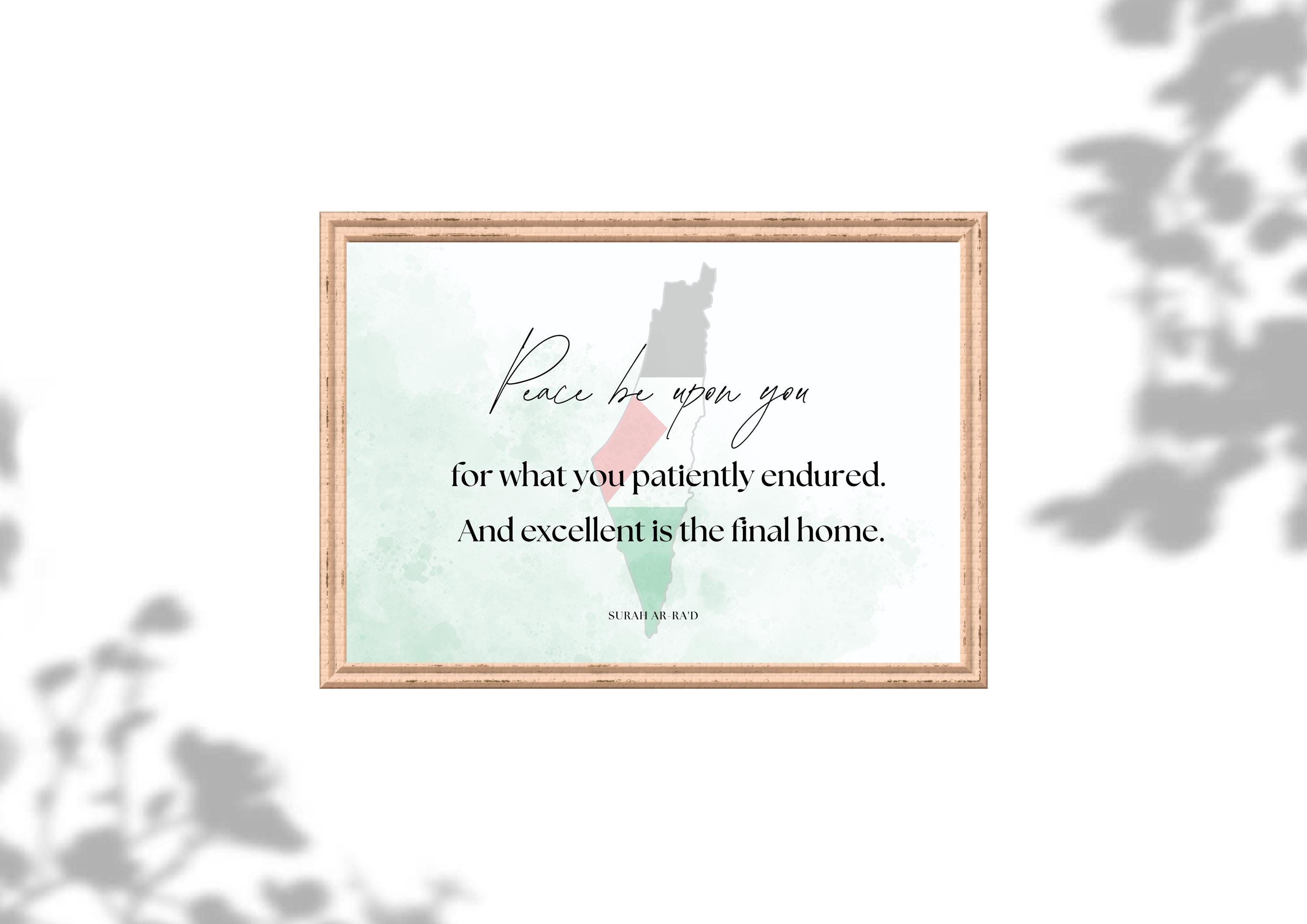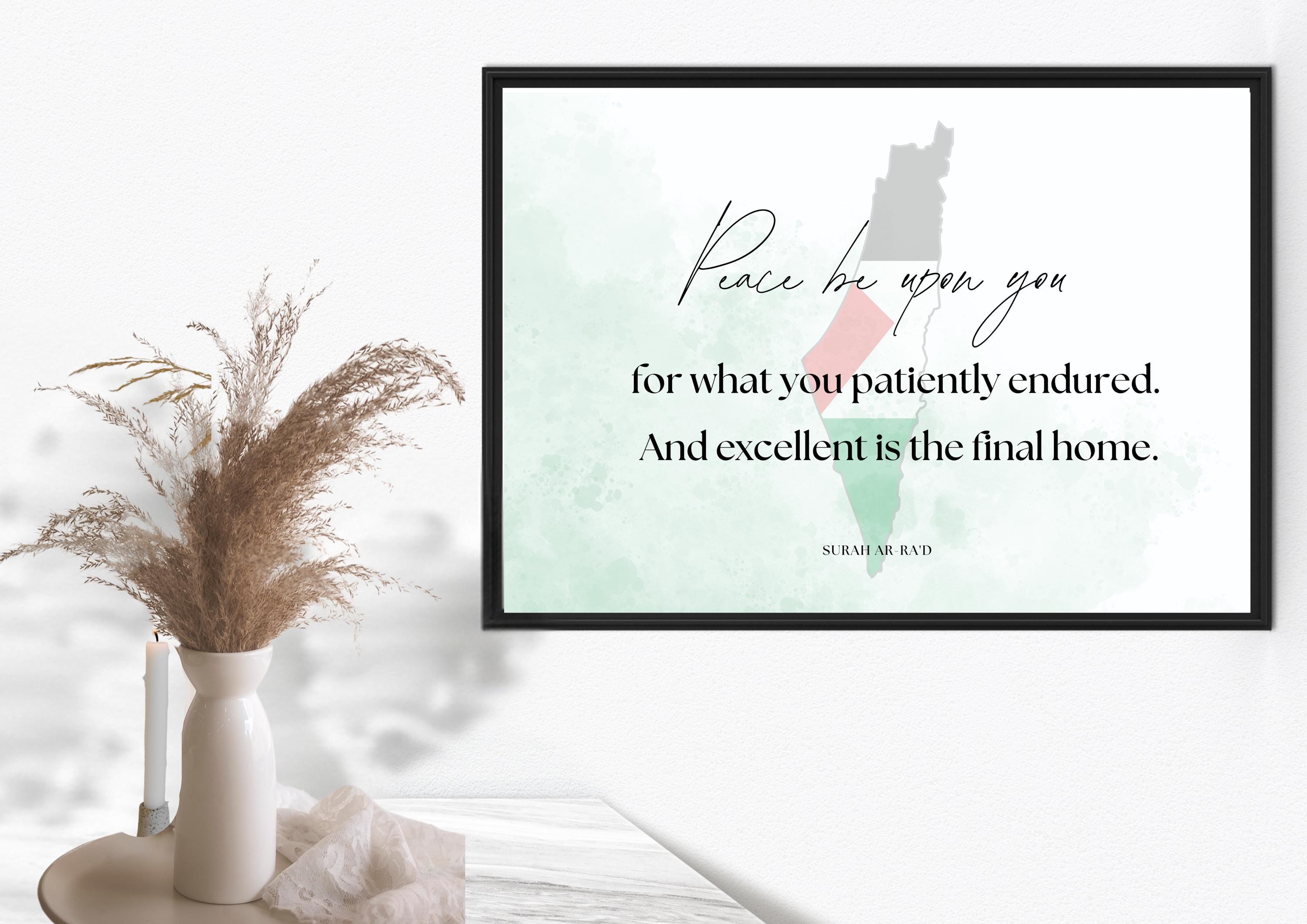 Elevate your home with this minimalist Islamic wall art featuring the Quranic verse: “Peace be upon you for what you patiently endured. And excellent is the final home.” (Surah Ar-Ra’d). Designed with a Palestine-inspired watercolor background, this digital download is perfect for Muslim home décor, prayer spaces, and thoughtful Islamic gifts.