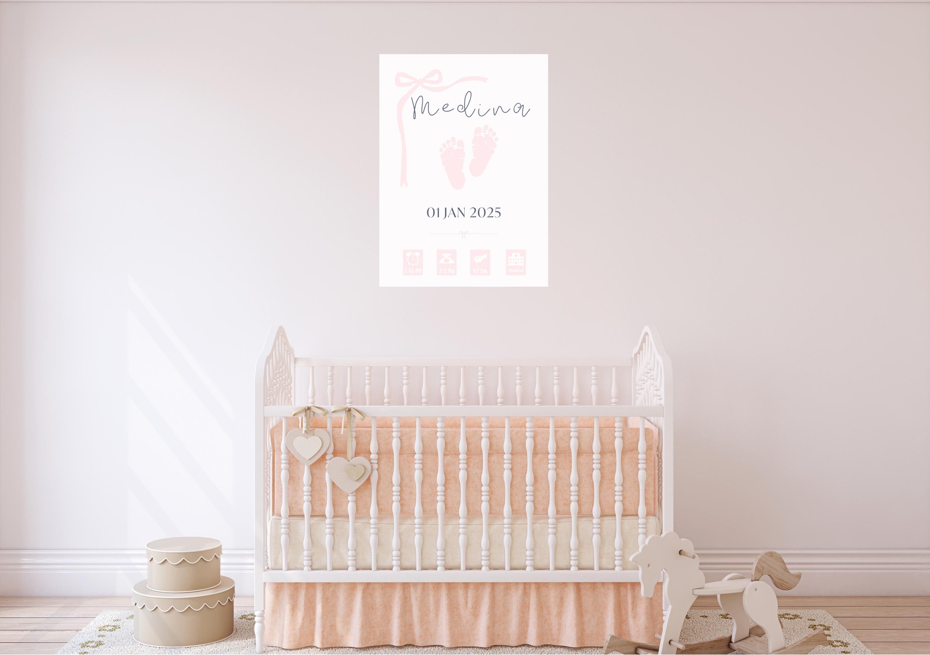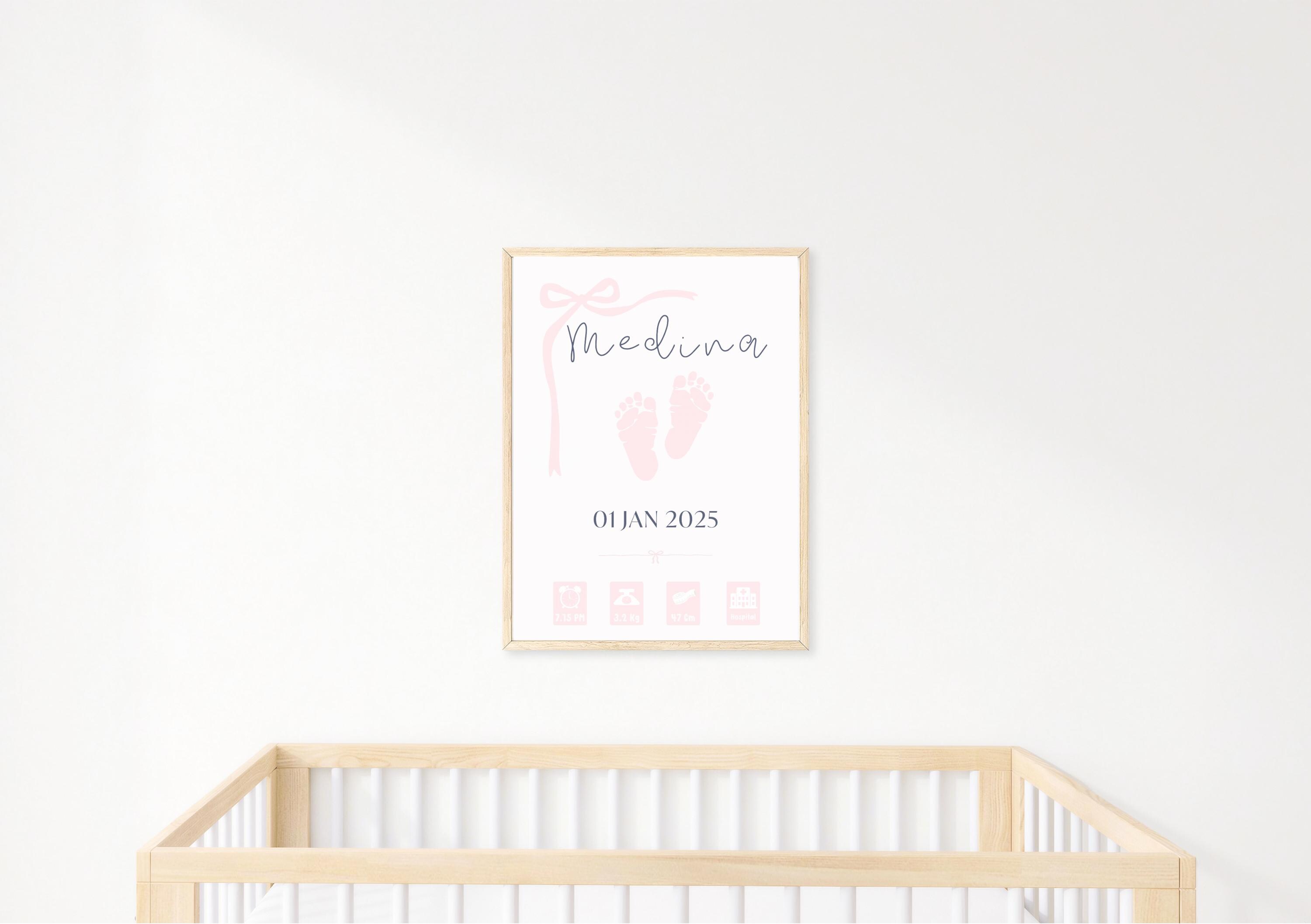 Welcome your little princess with this personalised baby girl birth announcement print, designed in soft pink with sweet footprints and a delicate ribbon accent – the perfect addition to any nursery or a thoughtful gift for new parents.