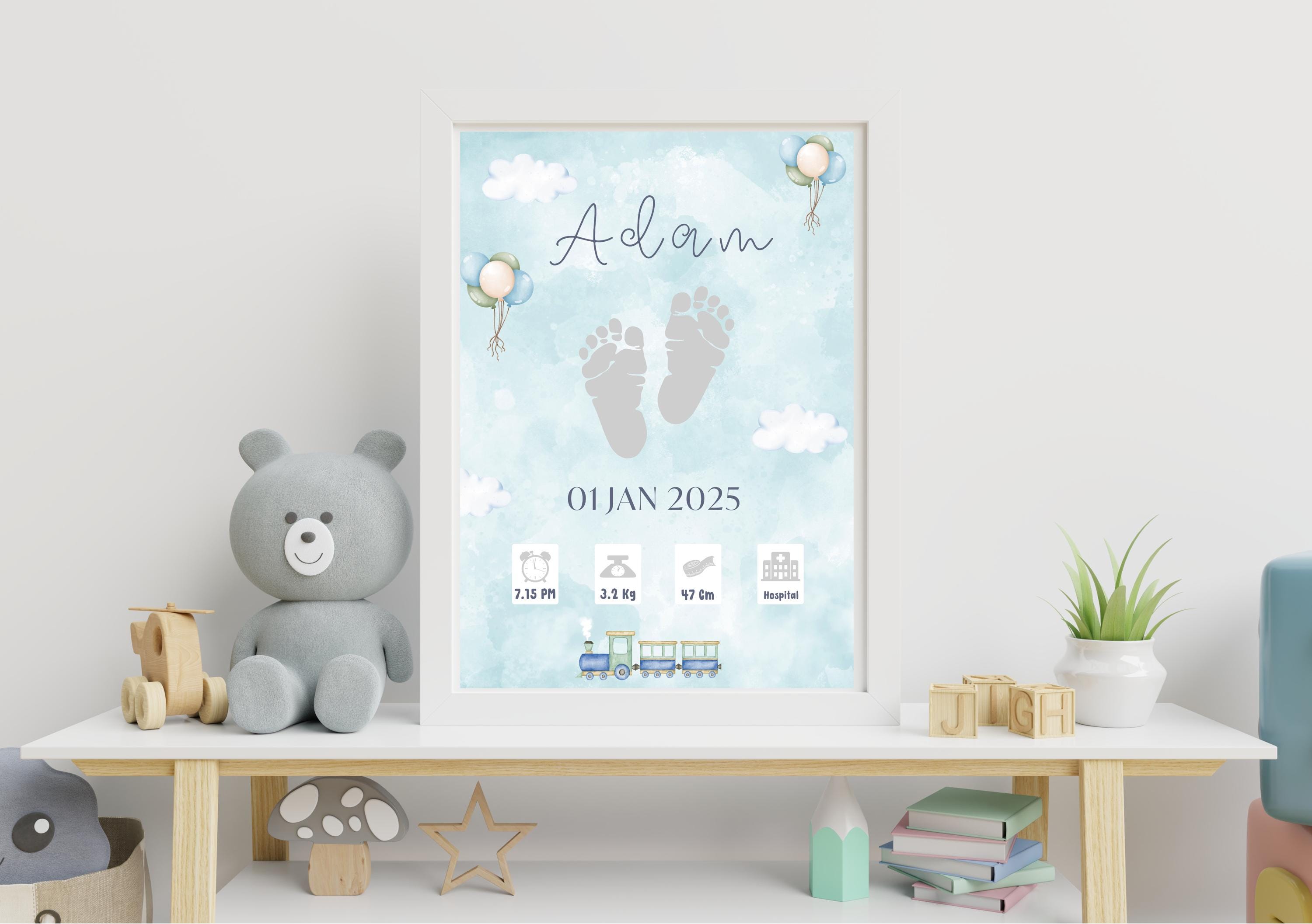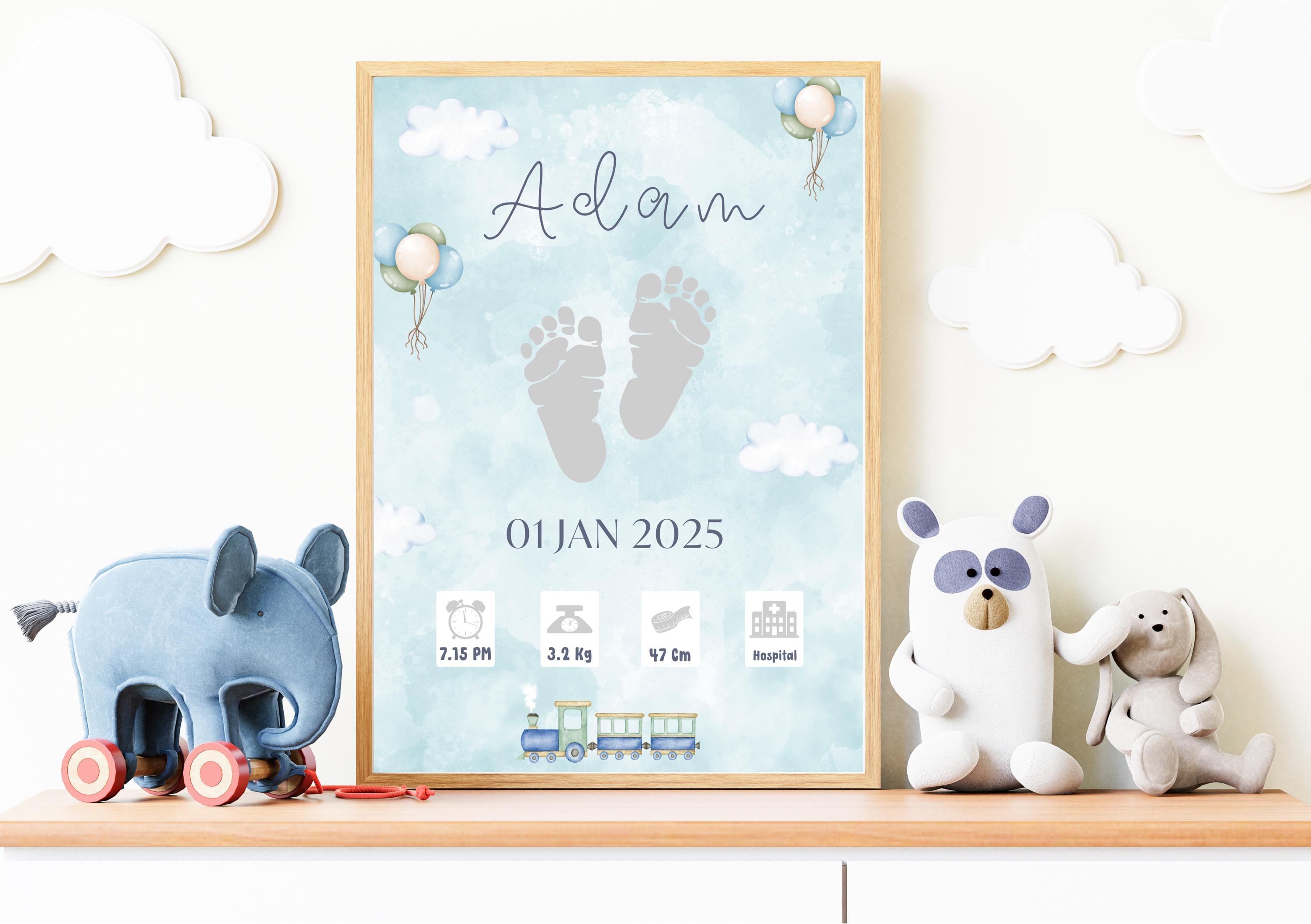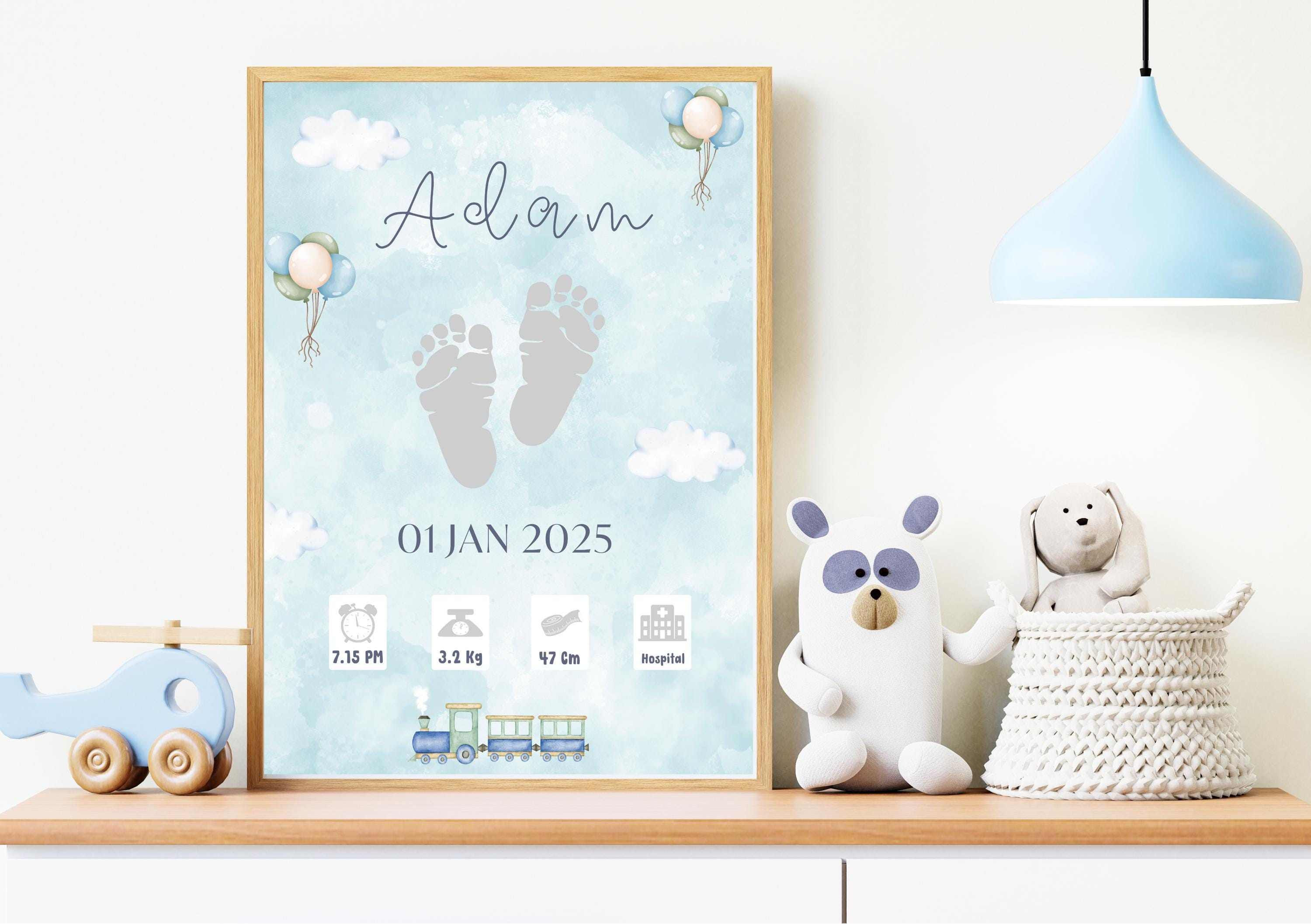 This print features your baby’s name, date of birth, time, weight, length, and place of birth, along with sweet footprints – perfect for a nursery, keepsake, or thoughtful gift.