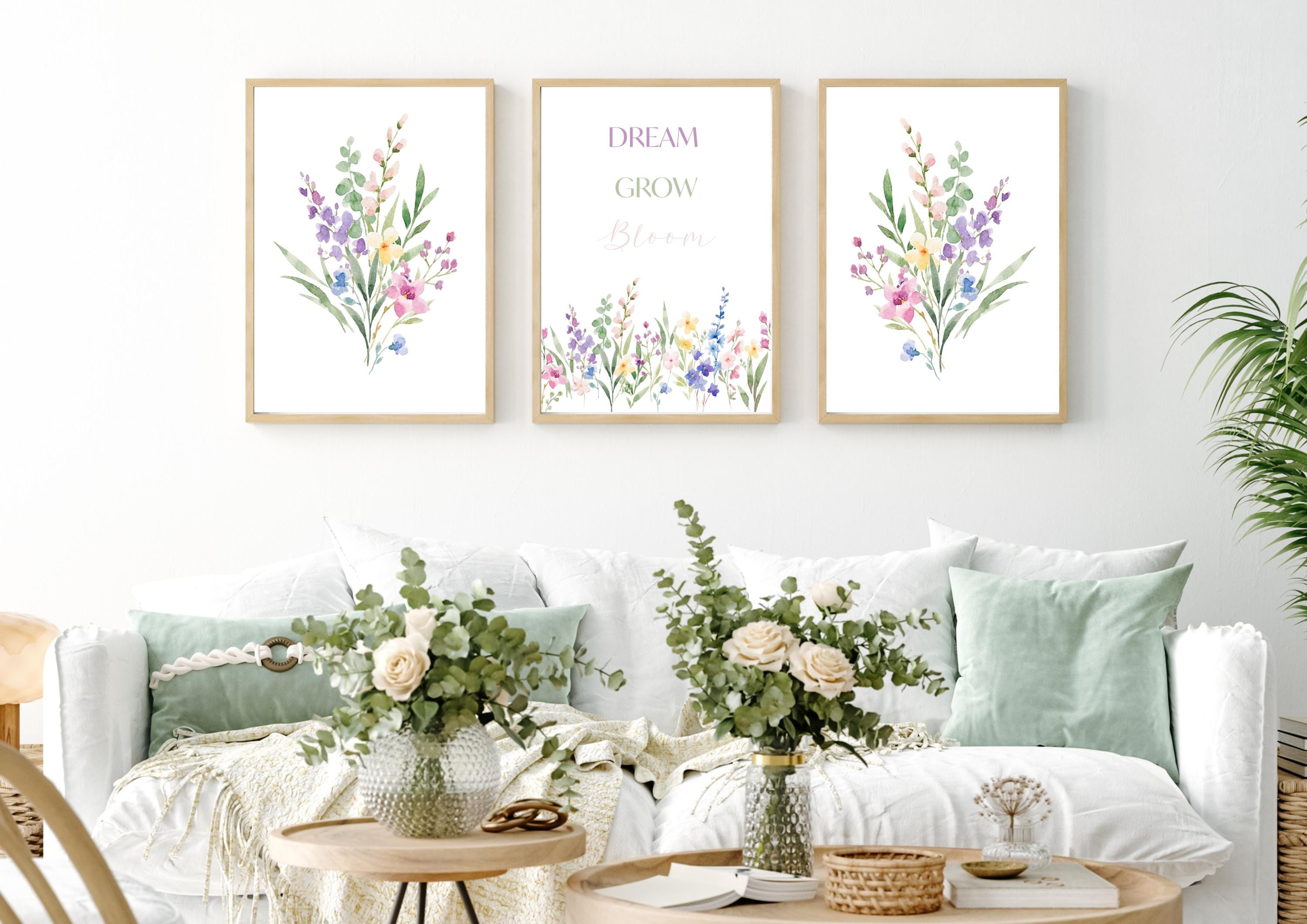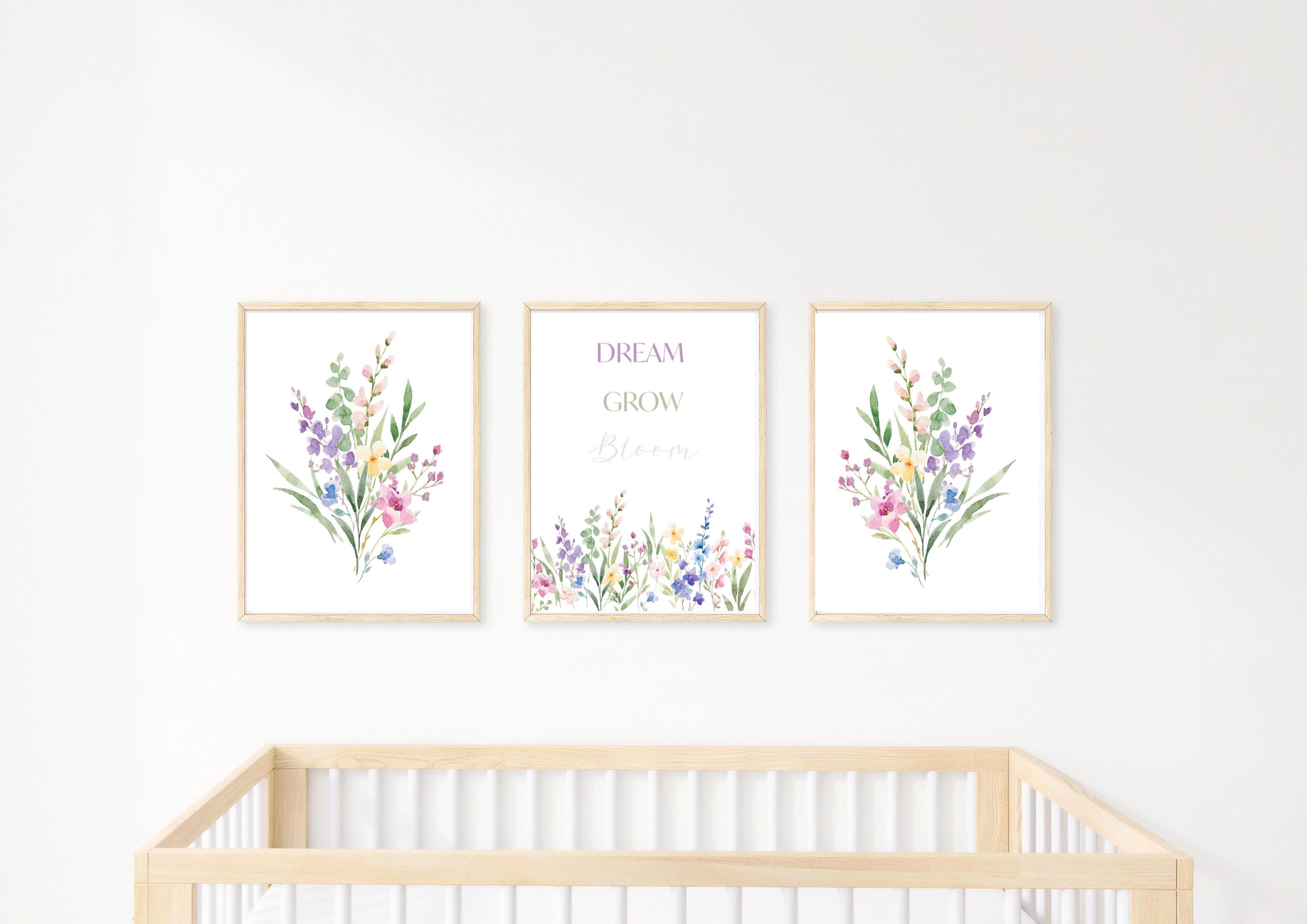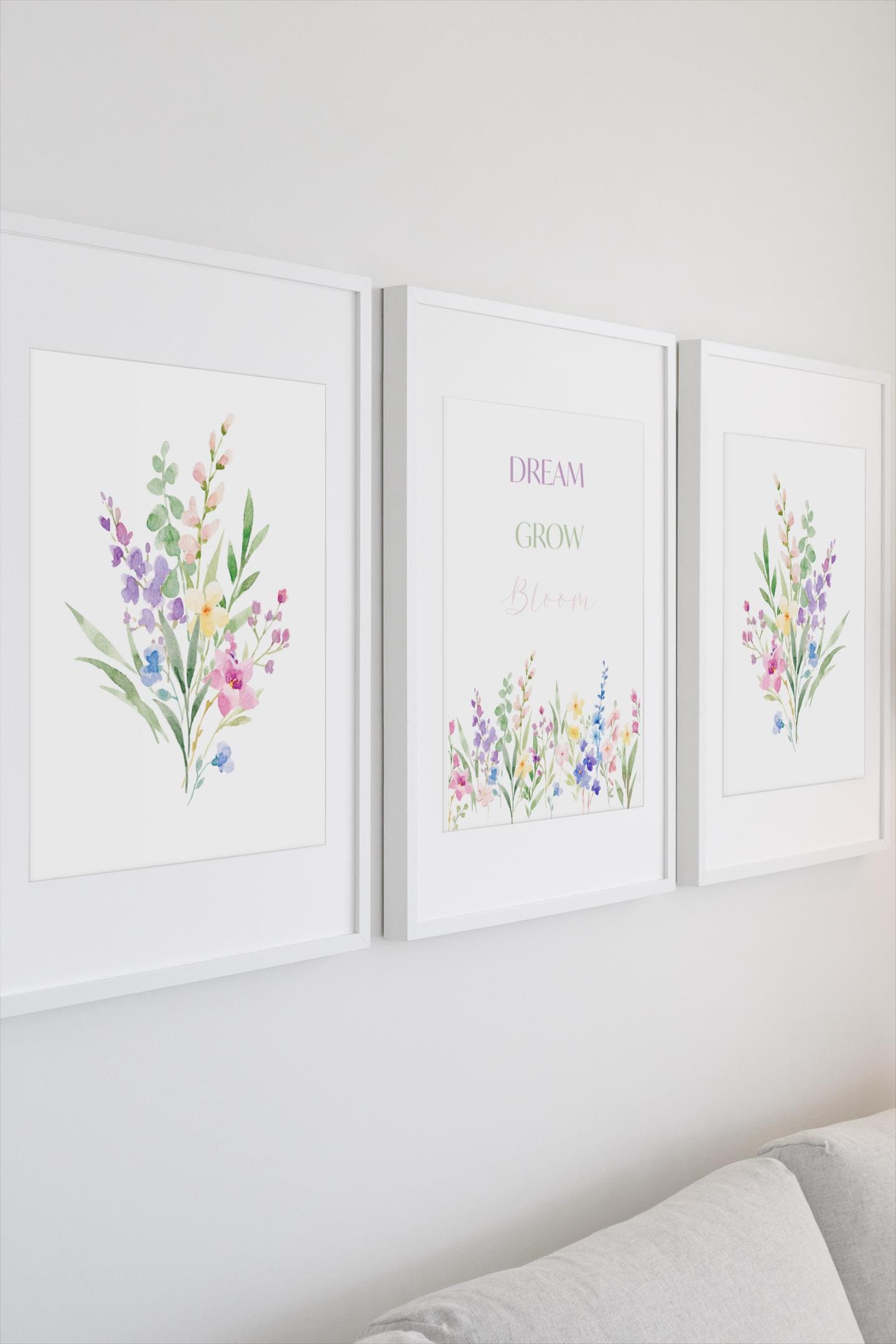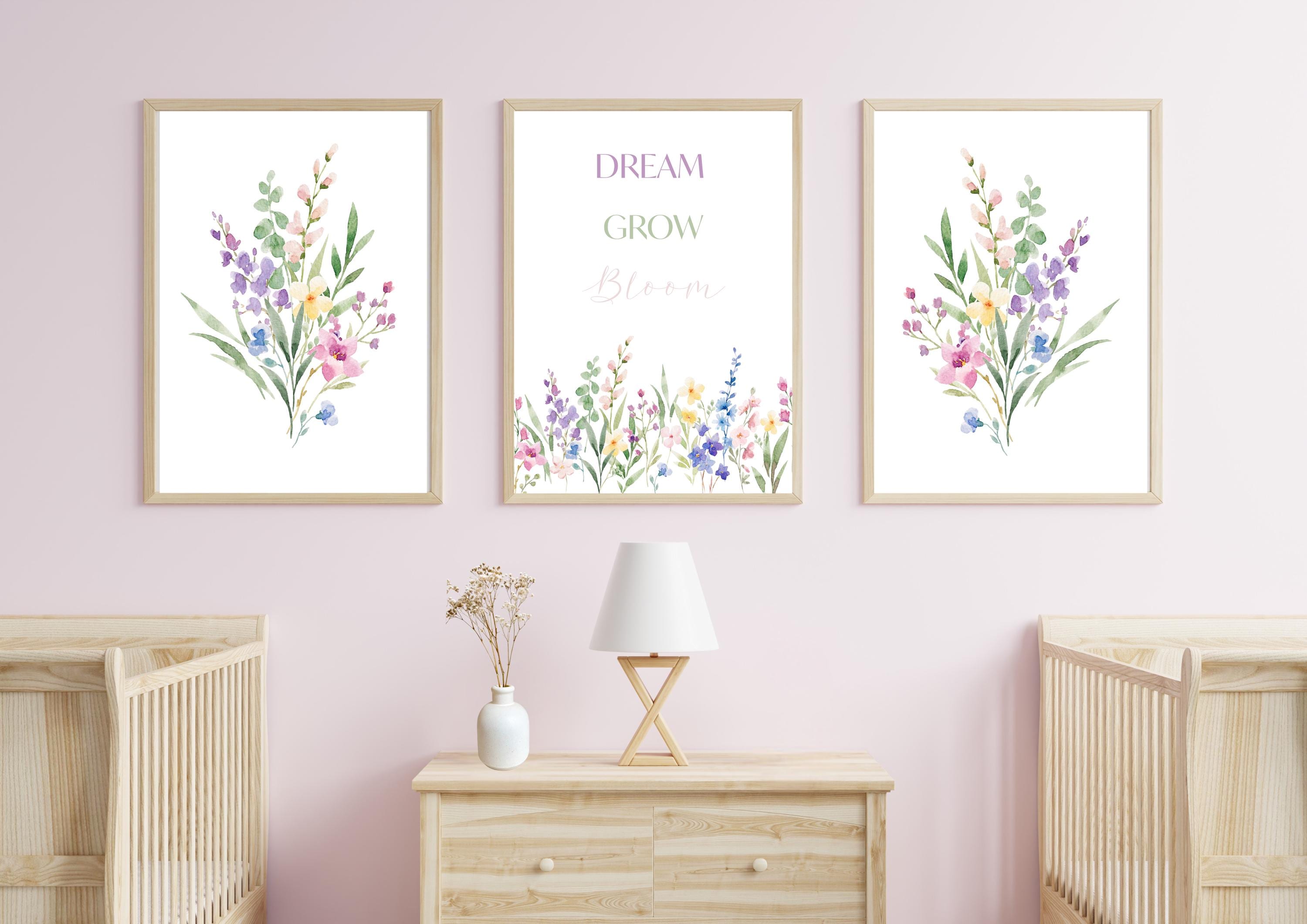 Bring a touch of soft beauty to your little one’s room with this Wildflower Nursery Wall Art Set. This downloadable bundle includes 3 high-resolution watercolor floral prints, featuring delicate pastel wildflowers and an inspiring “Dream, Grow, Bloom” quote — perfect for creating a peaceful and loving nursery atmosphere.