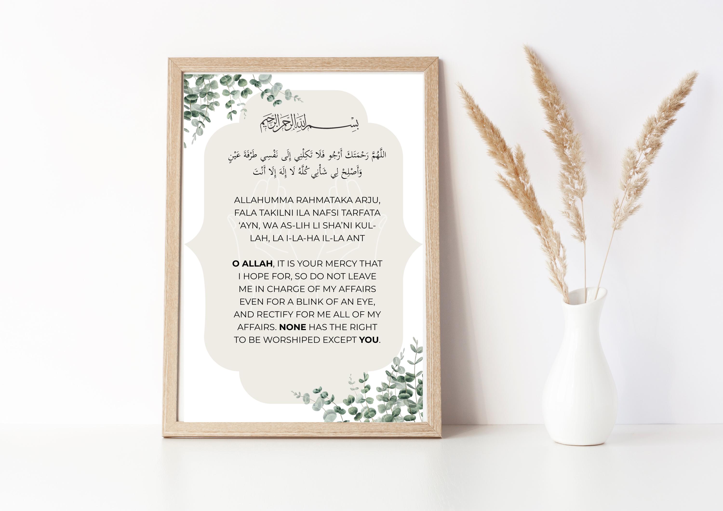 Enhance your home with this beautifully designed Islamic dua wall art printable featuring the heartfelt supplication: “O Allah, do not leave me to myself even for the blink of an eye.” This meaningful prayer is a reminder of seeking Allah’s constant guidance, mercy, and protection.