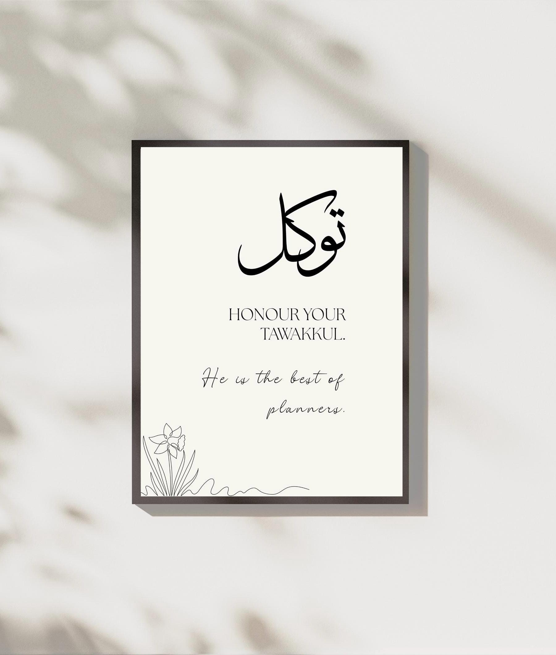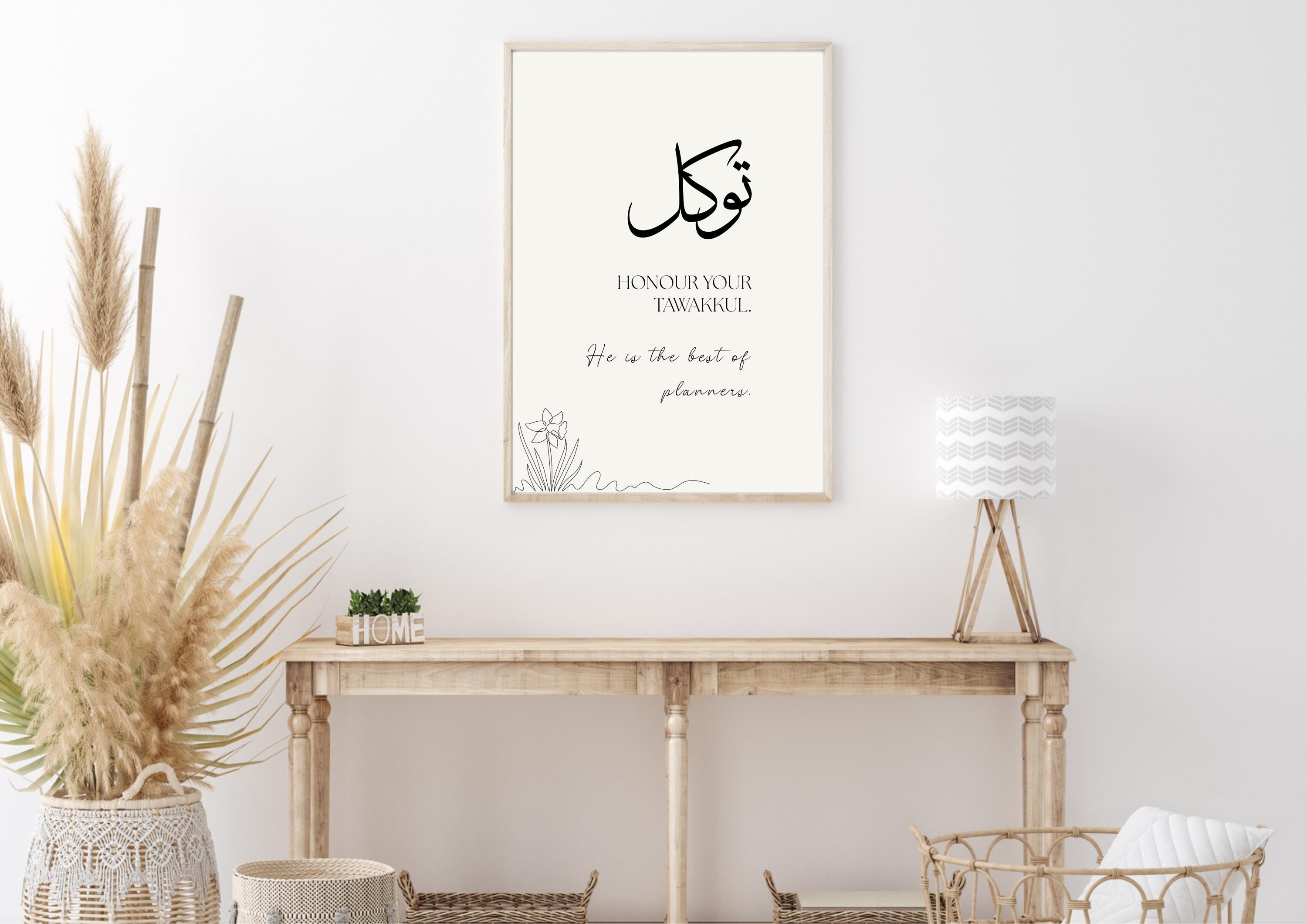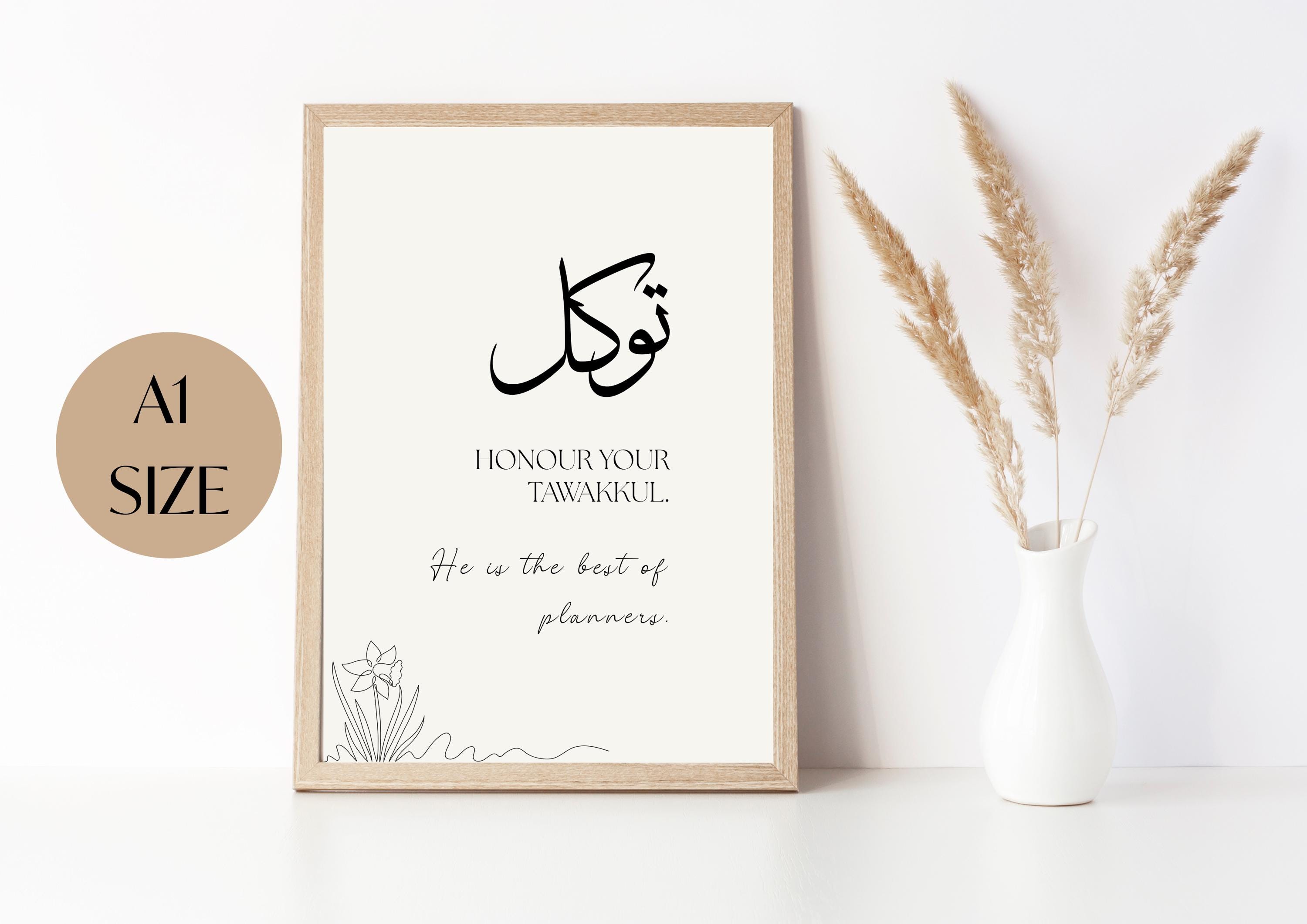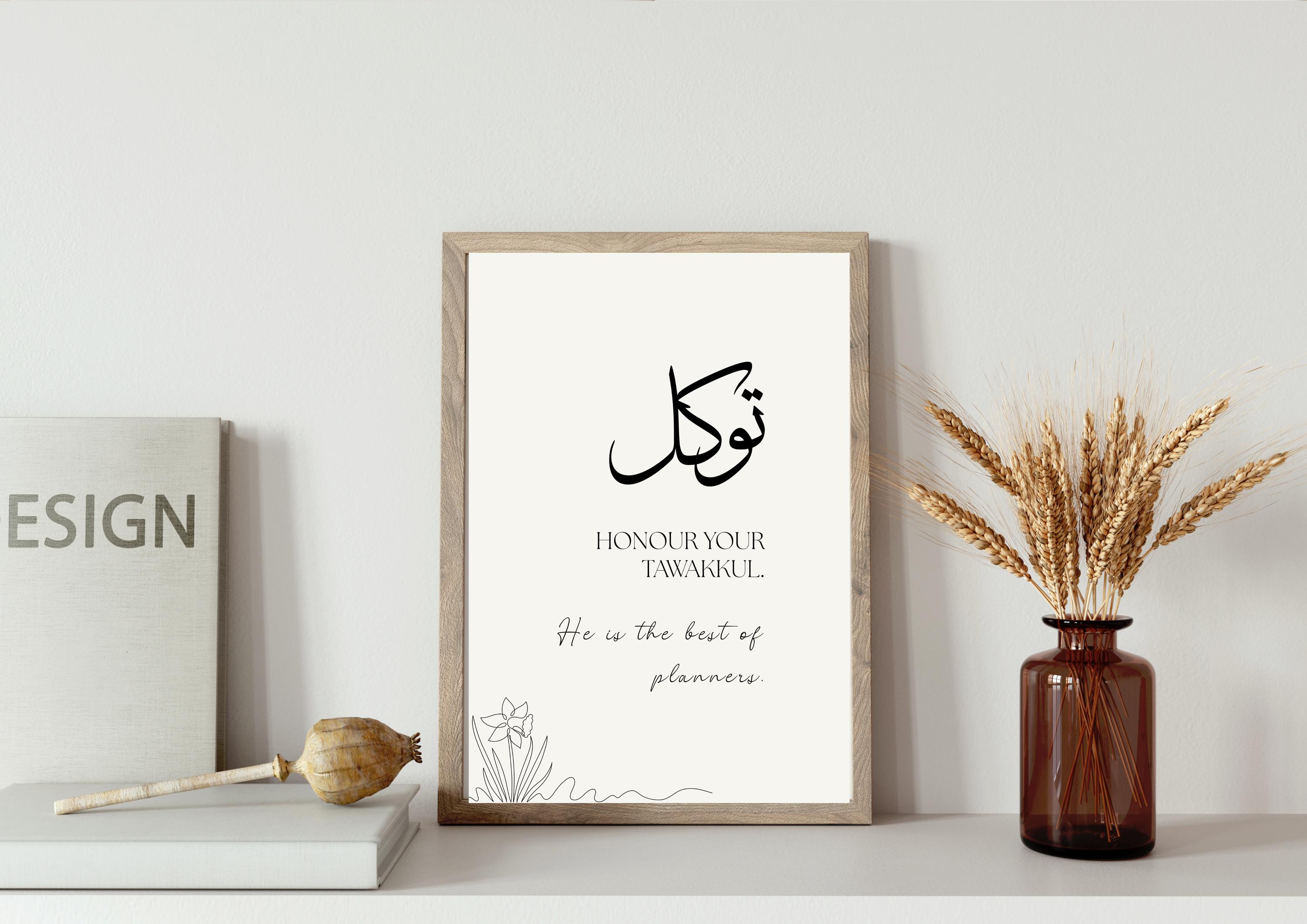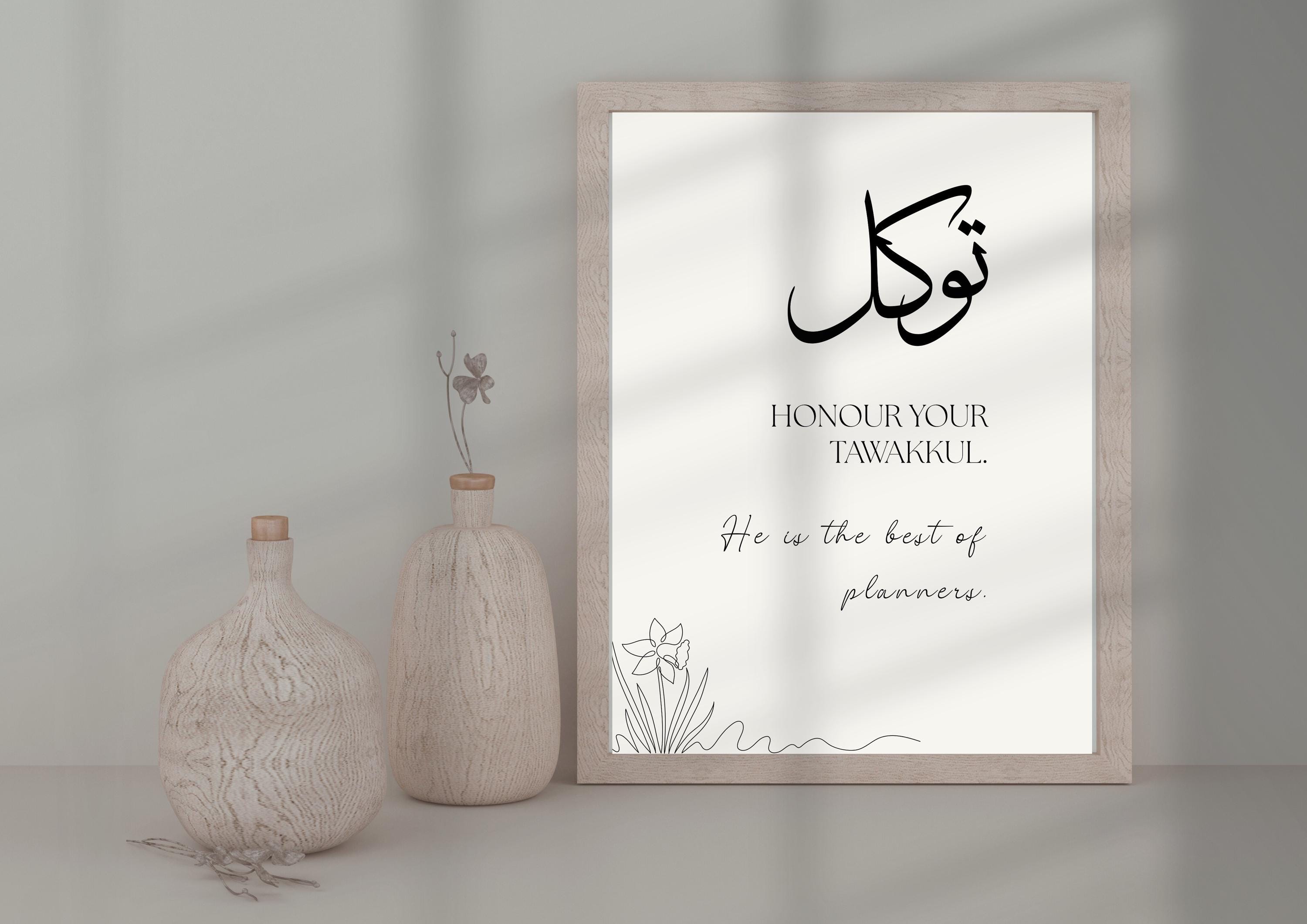 Fill your space with trust and peace through this elegant Islamic wall art featuring the Arabic word “Tawakkul” (توكل) and the inspiring quote “Honour your Tawakkul. He is the best of planners.”