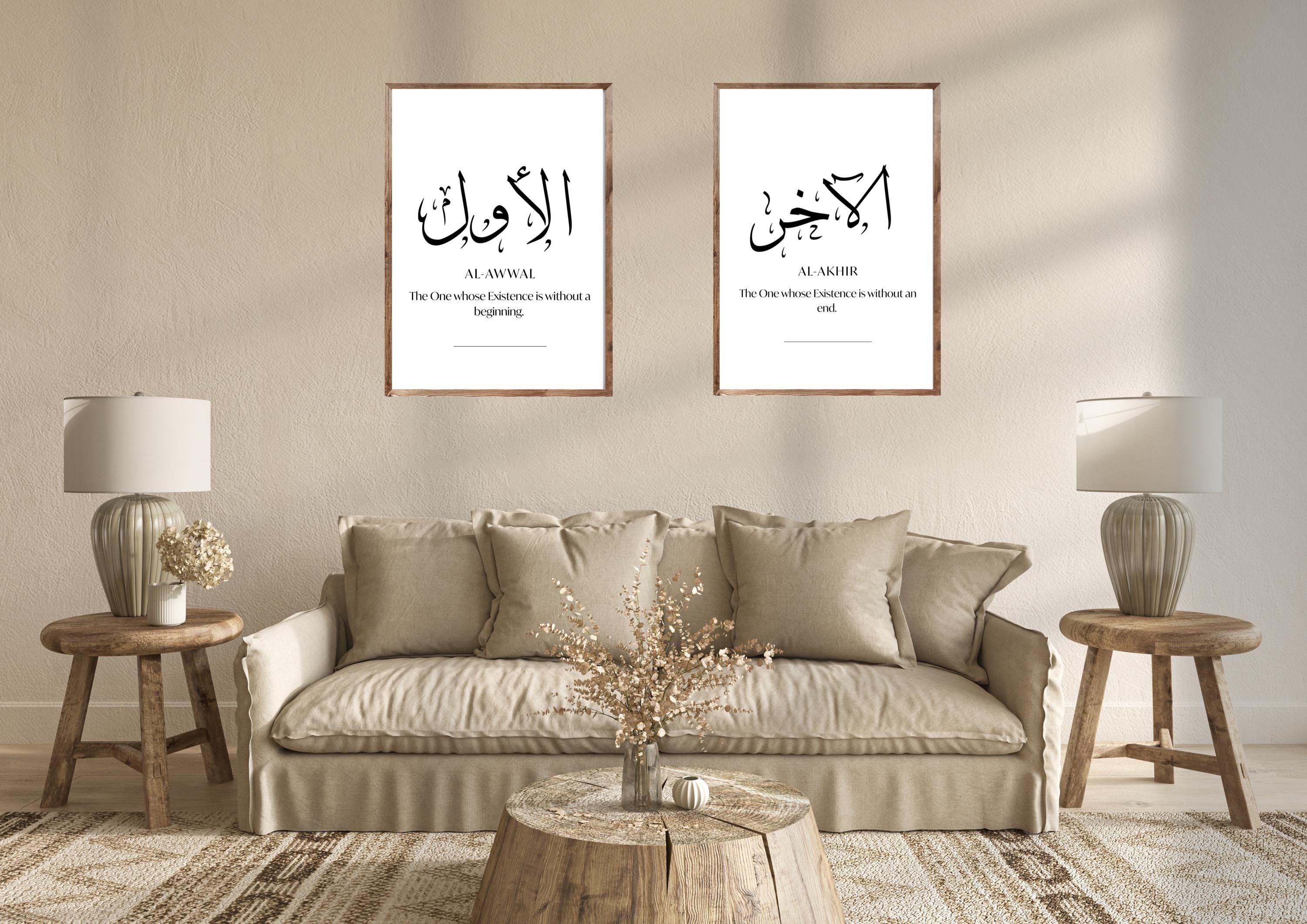 Bring timeless beauty and spiritual meaning into your space with this minimalist Arabic wall art set featuring two of the 99 Names of Allah — Al Awwal (The First) and Al Akhir (The Last).