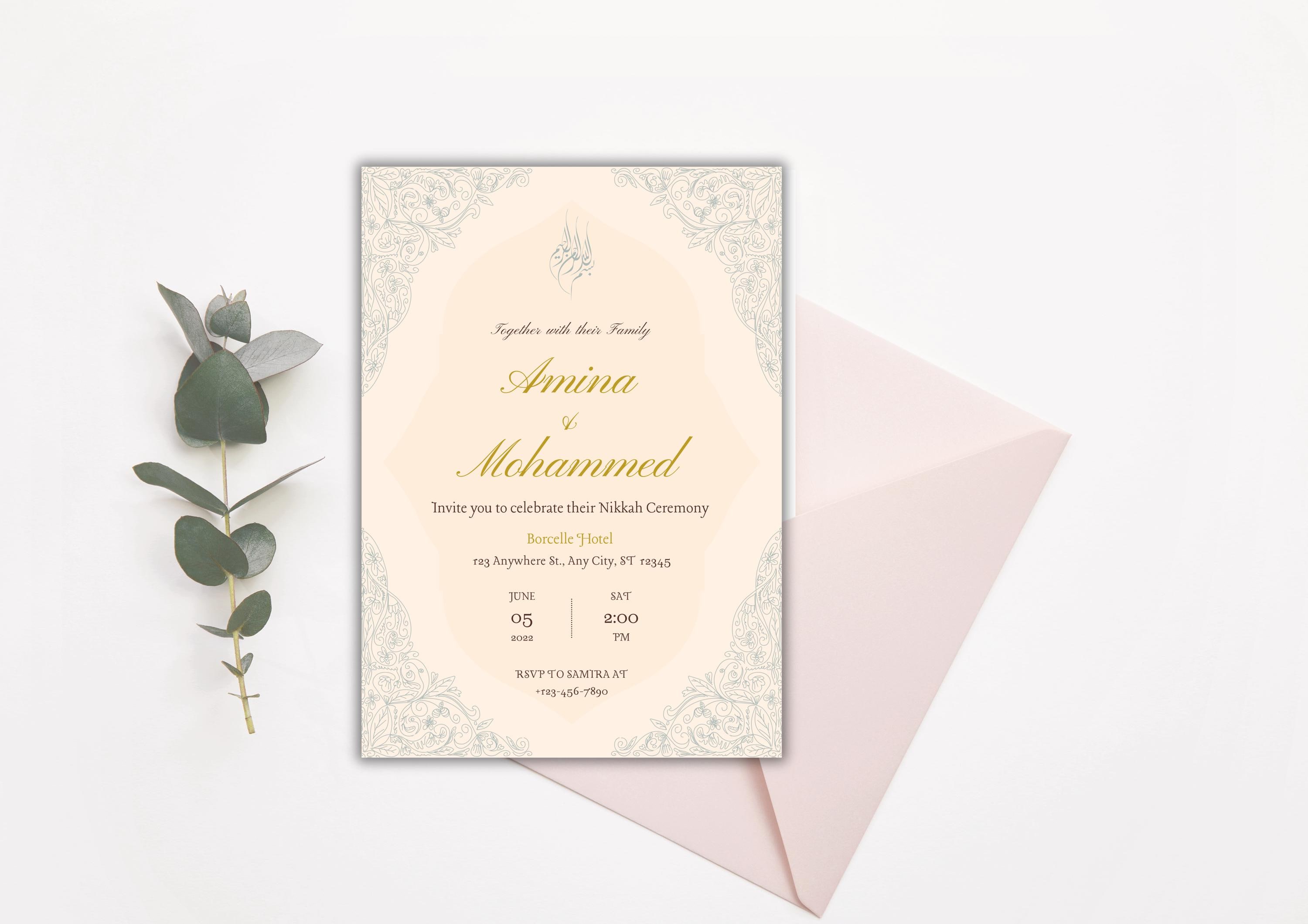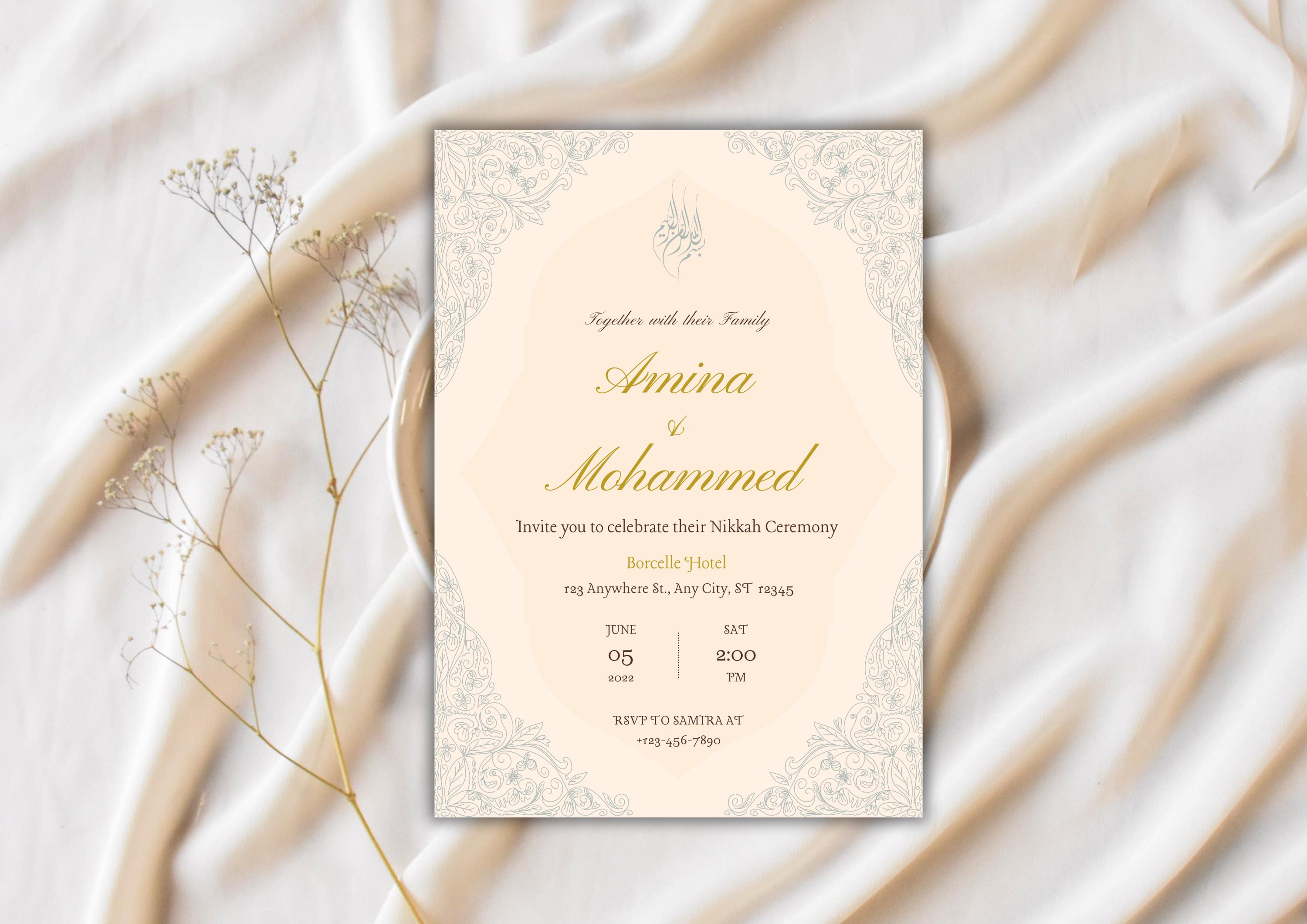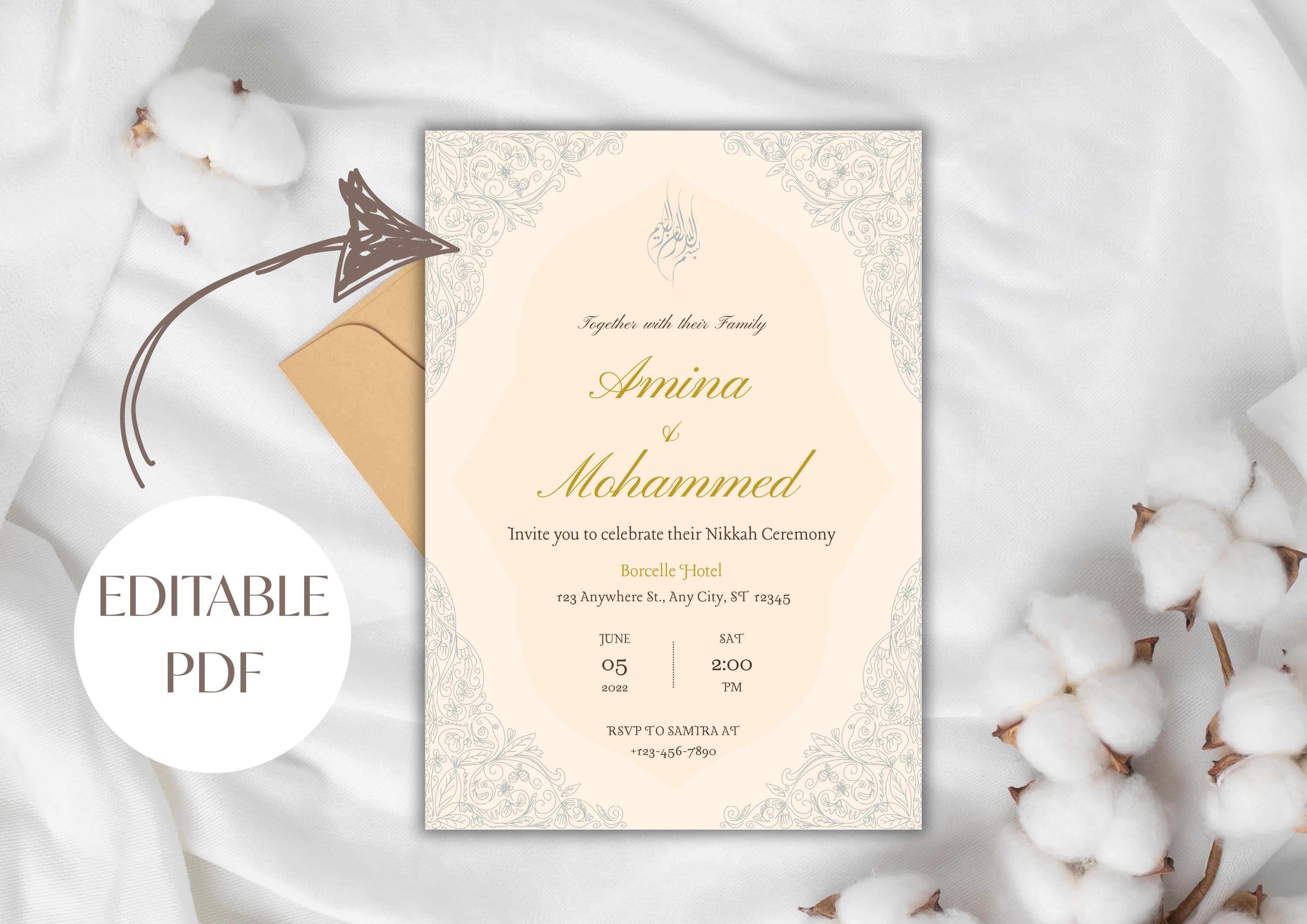 Celebrate your special day with this elegant Islamic Nikkah Invitation featuring intricate floral details and soft neutral tones. This editable Canva template is perfect for Muslim weddings, allowing you to easily personalize names, dates, venue, and RSVP info.