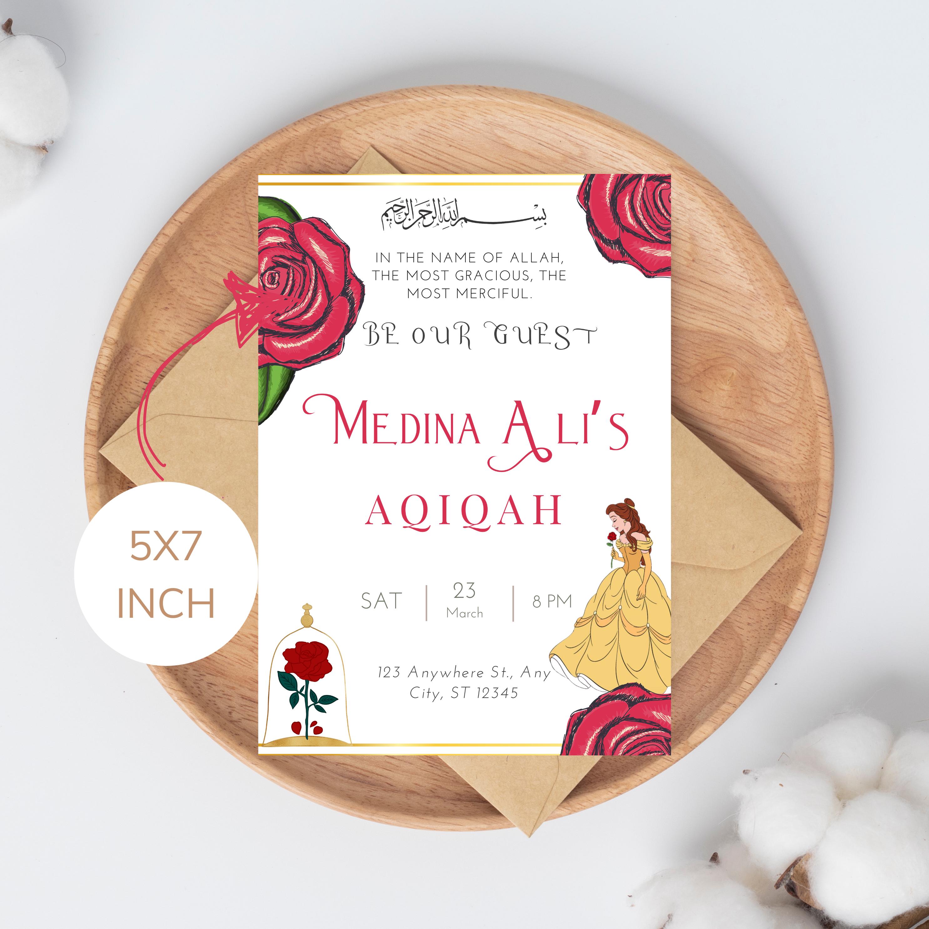 This beautifully designed Beauty and the Beast inspired Aqiqah invitation combines the elegance of classic Disney with the grace of Islamic tradition. With floral rose accents, Belle illustration, and “Bismillah” at the top, it’s the perfect invite to mark a special milestone in your baby girl’s life.